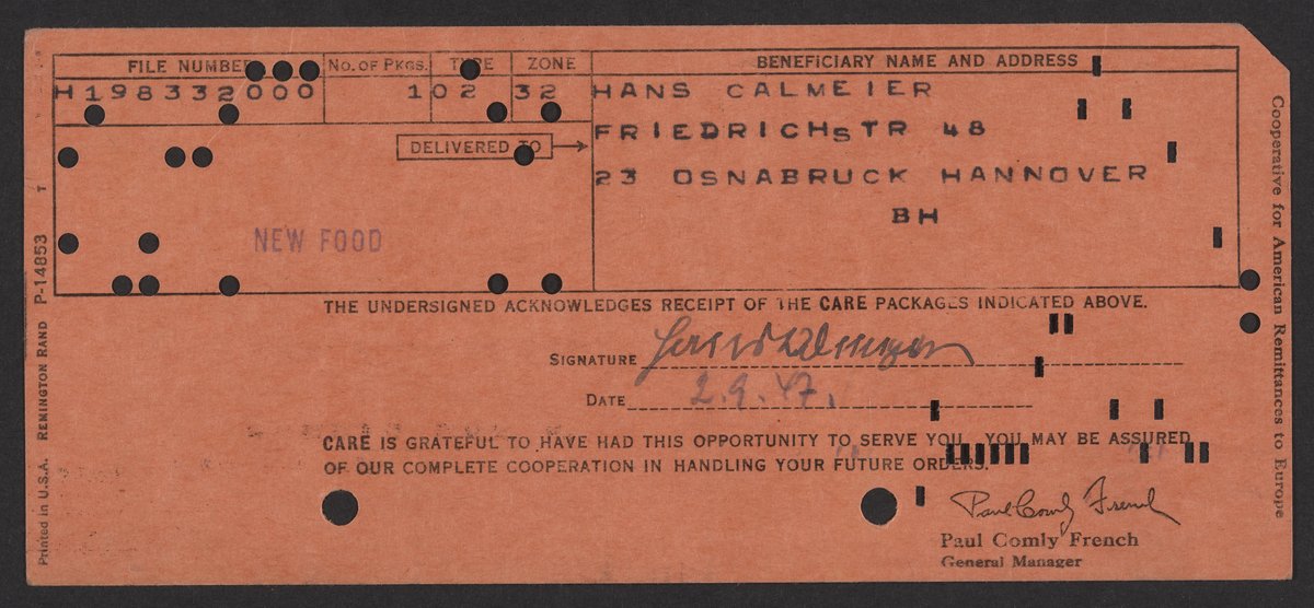 Small JPG1200 x 577px — 137 KBLarge JPG2880 x 1385px — 742 KBFull-sized JPG4934 x 2373px — 2.0 MBOriginal fileTIFF — 4934 x 2373px — 33.5 MBReceipts for the delivery of a food package from Cooperative American Remittances to Europe (CARE), from Max Albert Bredig (1902-1977). Receipts mention his friends Anny van der Sluys and Hans Calmeier. CARE, founded in 1945, is now known as Cooperative for Assistance and Relief Everywhere.