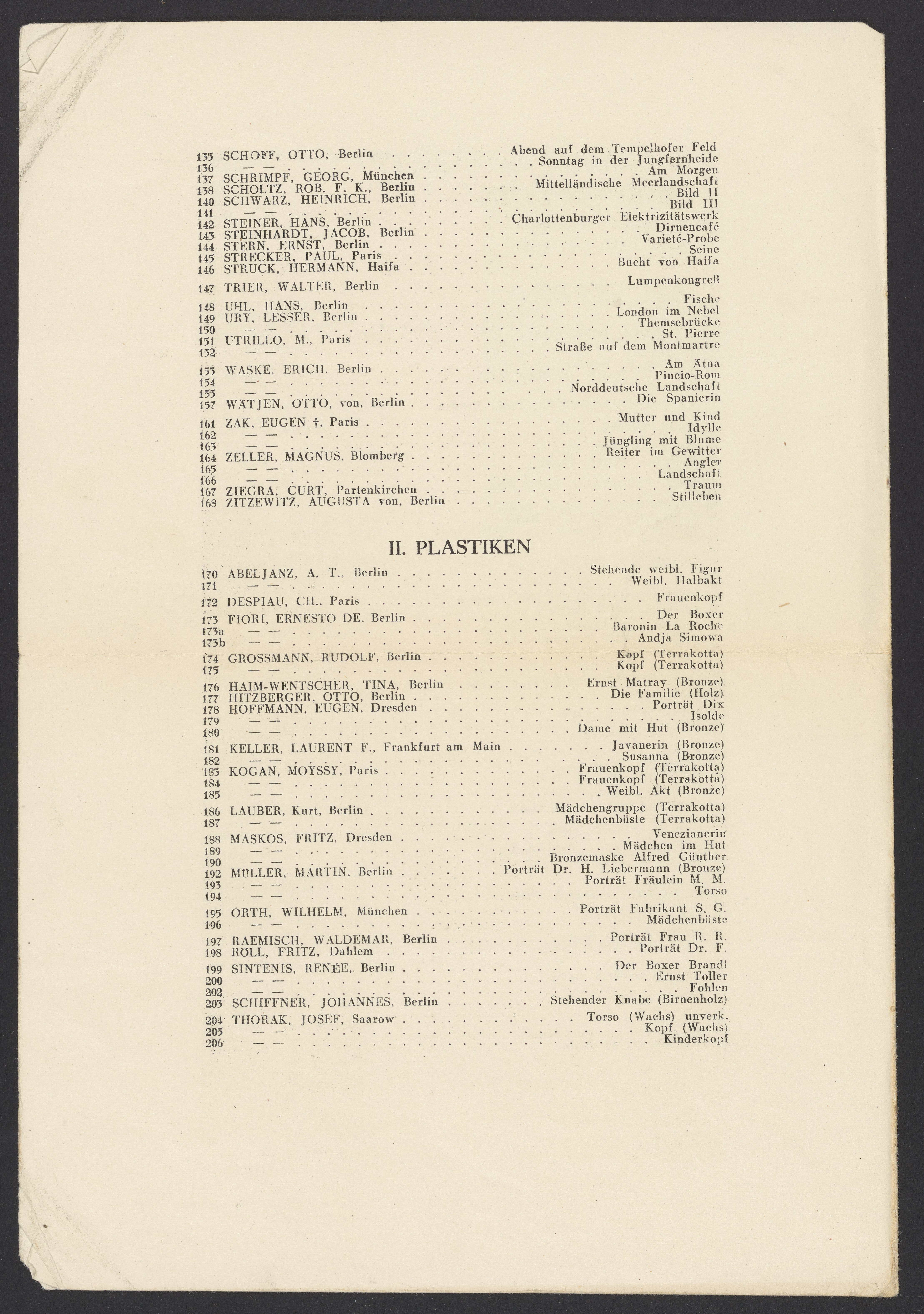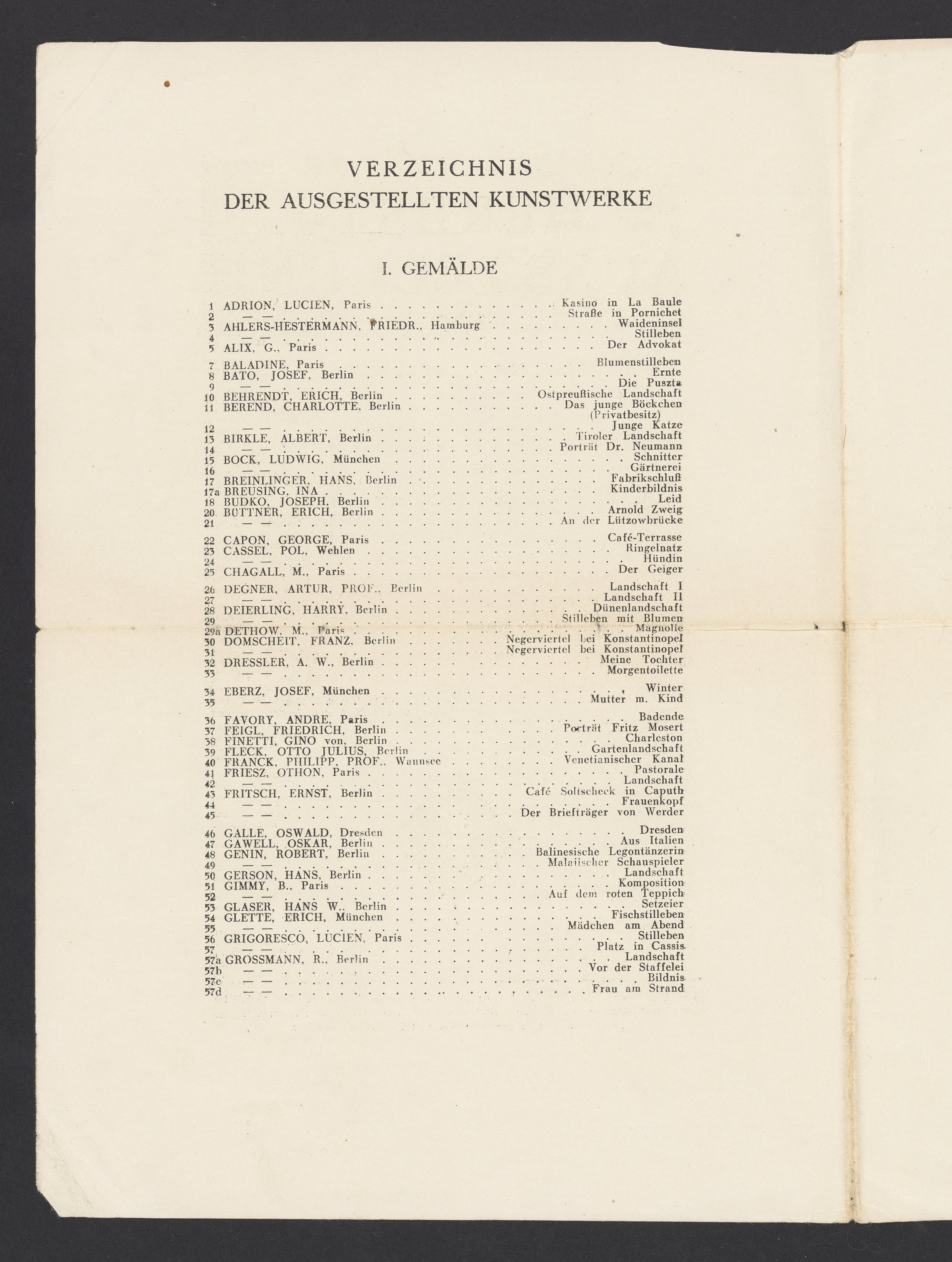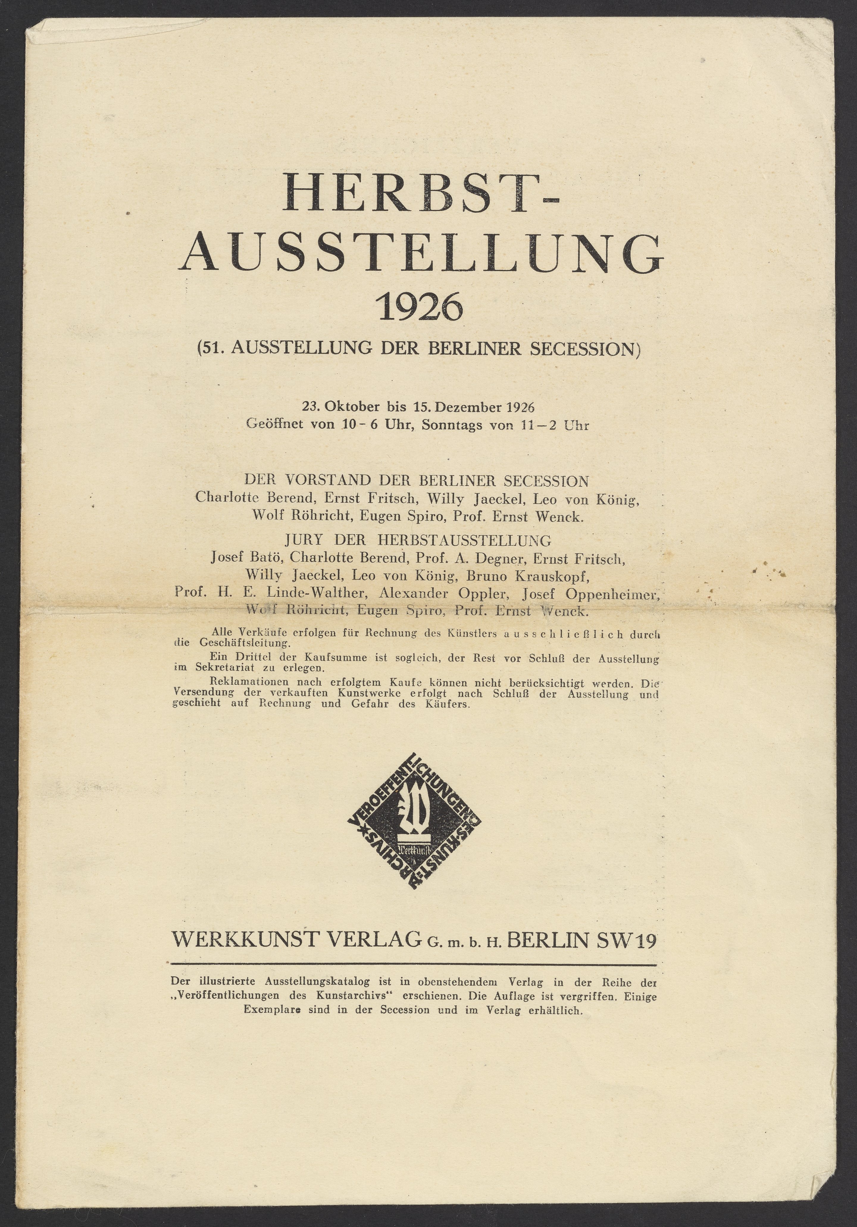 Fall exhibition catalog listing works of art on display at the 51st exhibition of the Berlin Secession, an art movement classified as a form of German Modernism established in Germany in the late 19th century. In reaction to the Association of Berlin Artists and the restrictions on contemporary art, artists "seceded," demonstrating against the standards of academic or government-endorsed art.