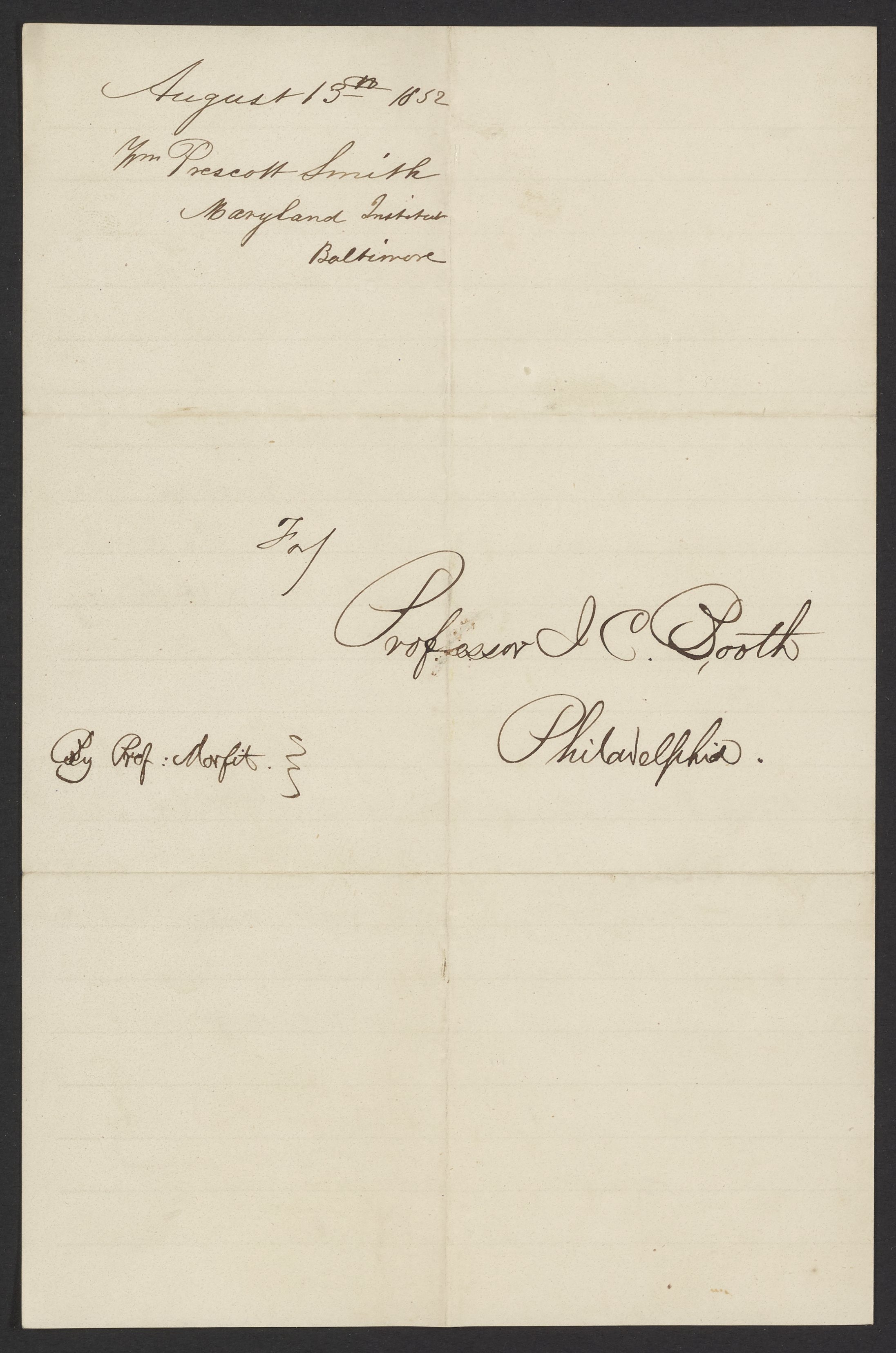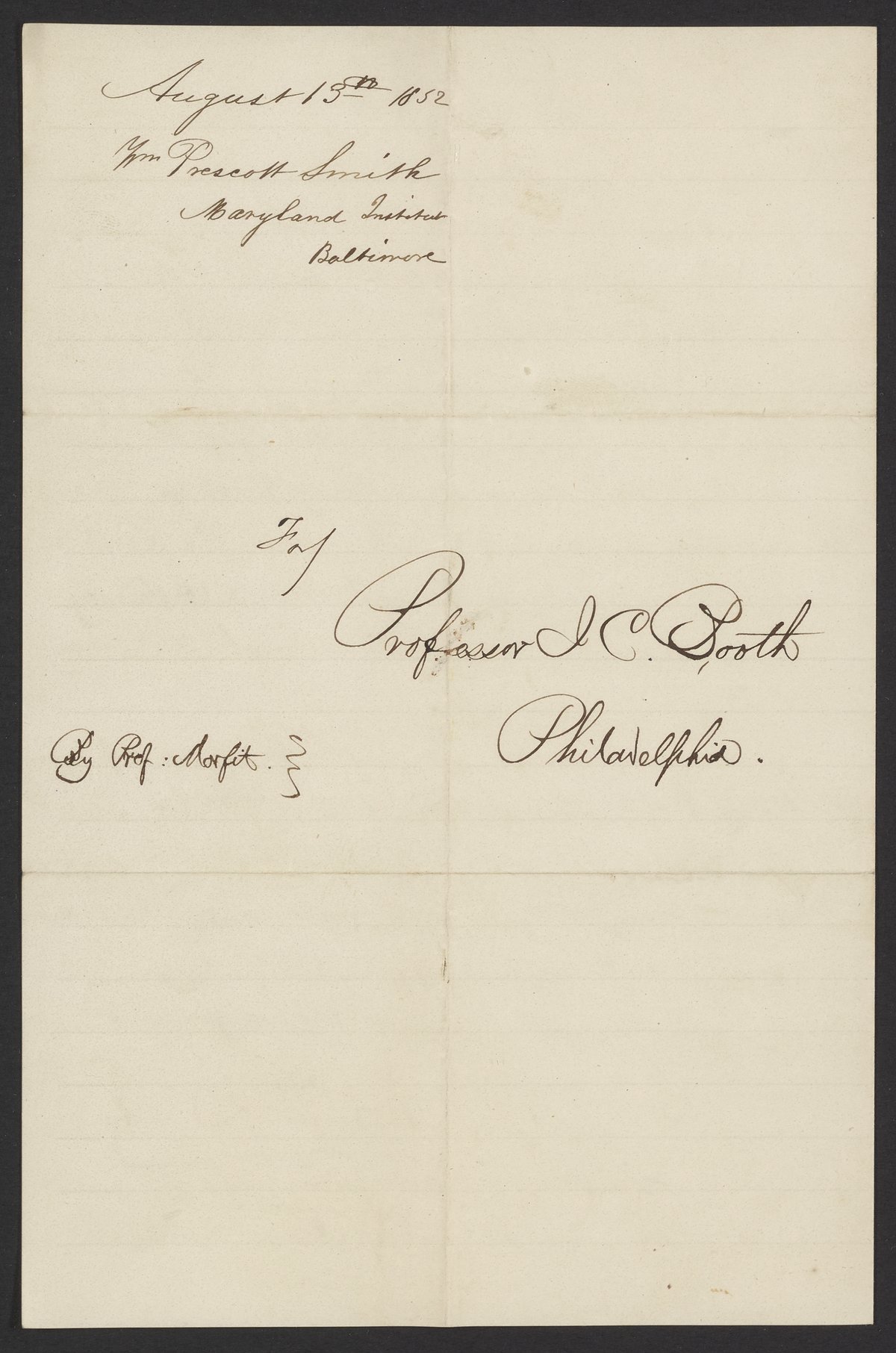 Smith, William Prescott. “Letter from William Prescott Smith to James Curtis Booth, August 13, 1852,” August 13, 1852. Papers of James Curtis Booth, Box 1, Folder 6. Science History Institute. Philadelphia. https://digital.sciencehistory.org/works/ljg444j.
