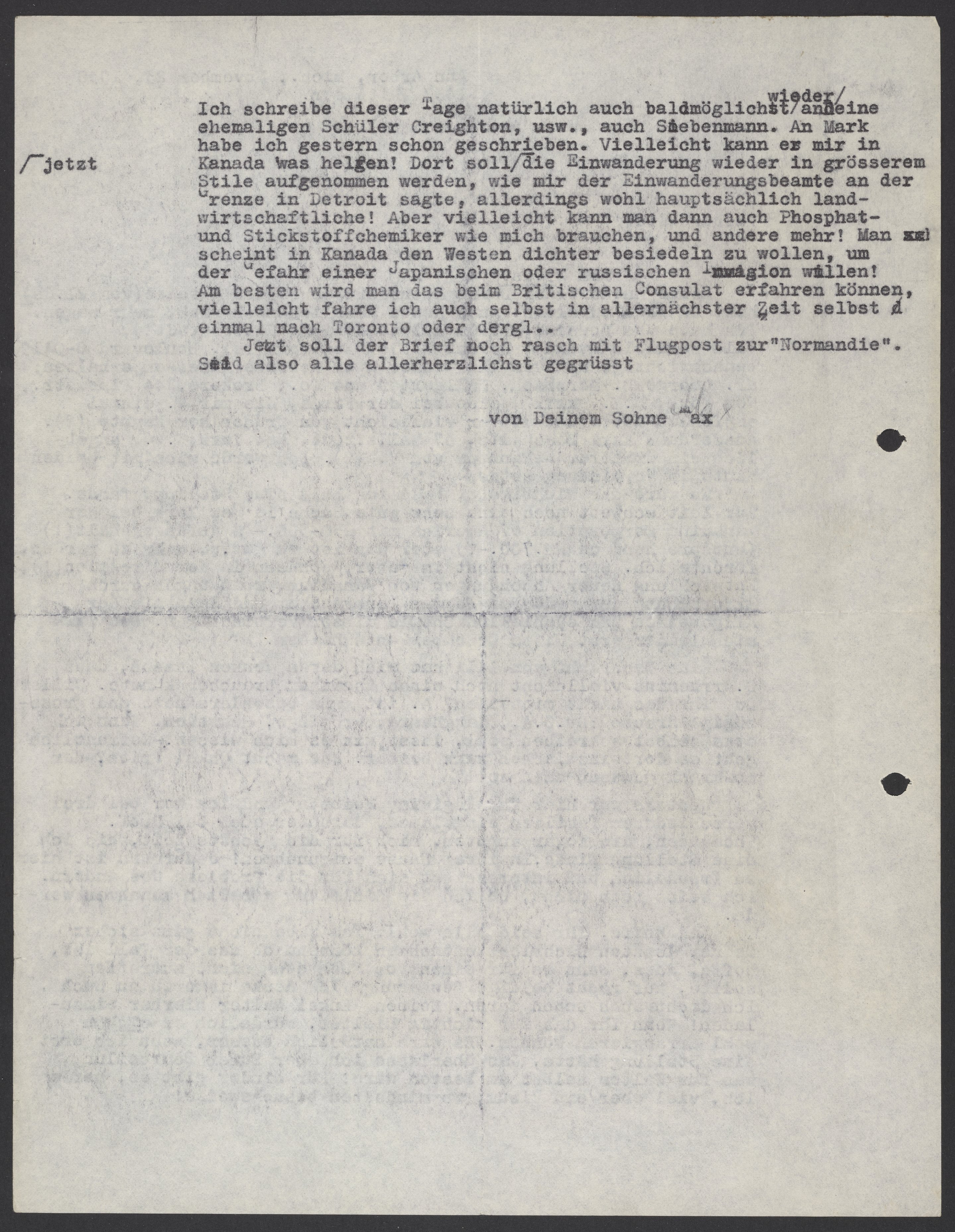Ich schreibe dieser Tage natürlich auch baldmöglichst wieder jetzt an deinen ehemaligen Schüler Creighton, usw., auch Siebenmann. An Mark habe ich gestern schon geschrieben. Vielleicht kann er mir in Kanada was helfen. Dort soll die Einwanderung wieder in grösserem Stile aufgenommen werden, wie mir der Einwanderungsbeamte an der Grenze in Detroit sagte, allerdings wohl hauptsächlich landwirtschaftliche! Aber vielleicht kann man dann auch Phosphat-und Stickstoffchemiker wie mich brauchen, und andere mehr! Man scheint in Kanada den Westen dichter besiedeln zu wollen, um der Gefahr einer Japanischen oder russischen Immagion wollen! Am besten wird man das beim Britischen Consulat erfahren können, vielleicht fahre ich auch selbst in allernächster Zeit selbst einmal noch Toronto oder dergl..