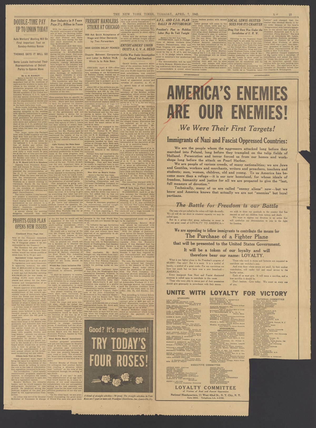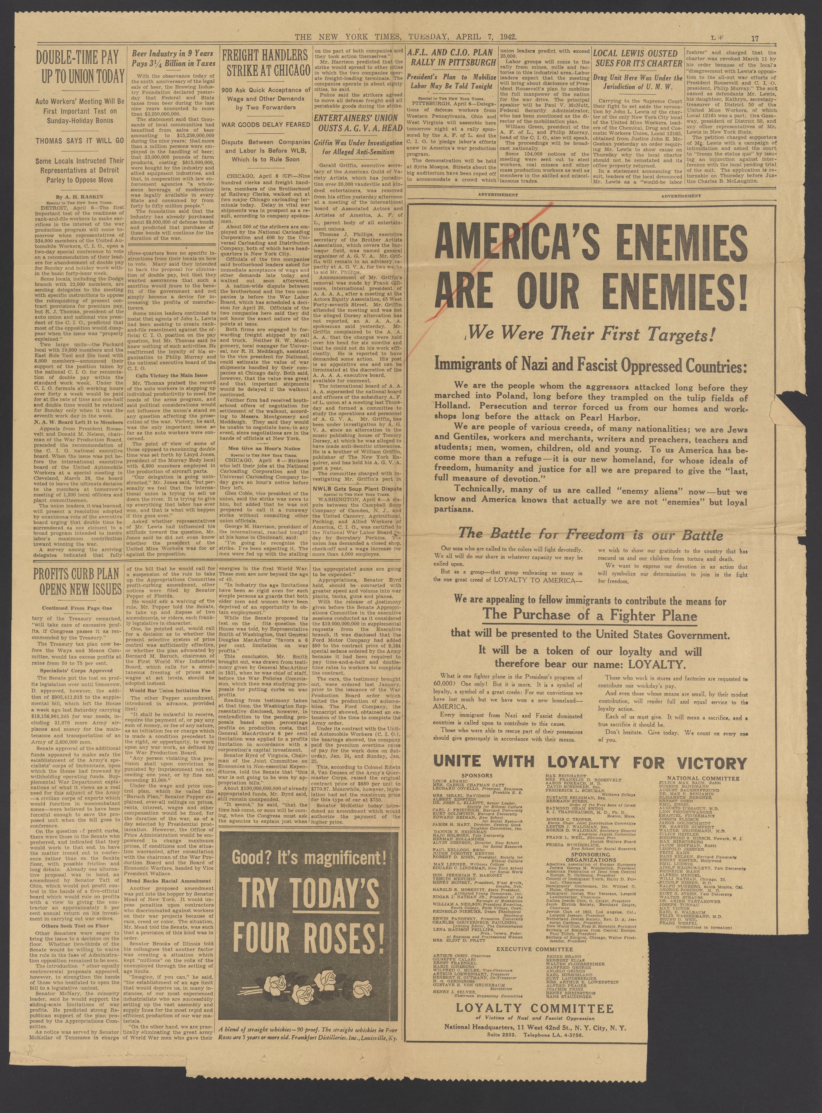New York times. “America's Enemies Are Our Enemies,” April 7, 1942. Papers of Georg and Max Bredig, Box 10, Folder 26. Science History Institute. Philadelphia. https://digital.sciencehistory.org/works/lo68iua.