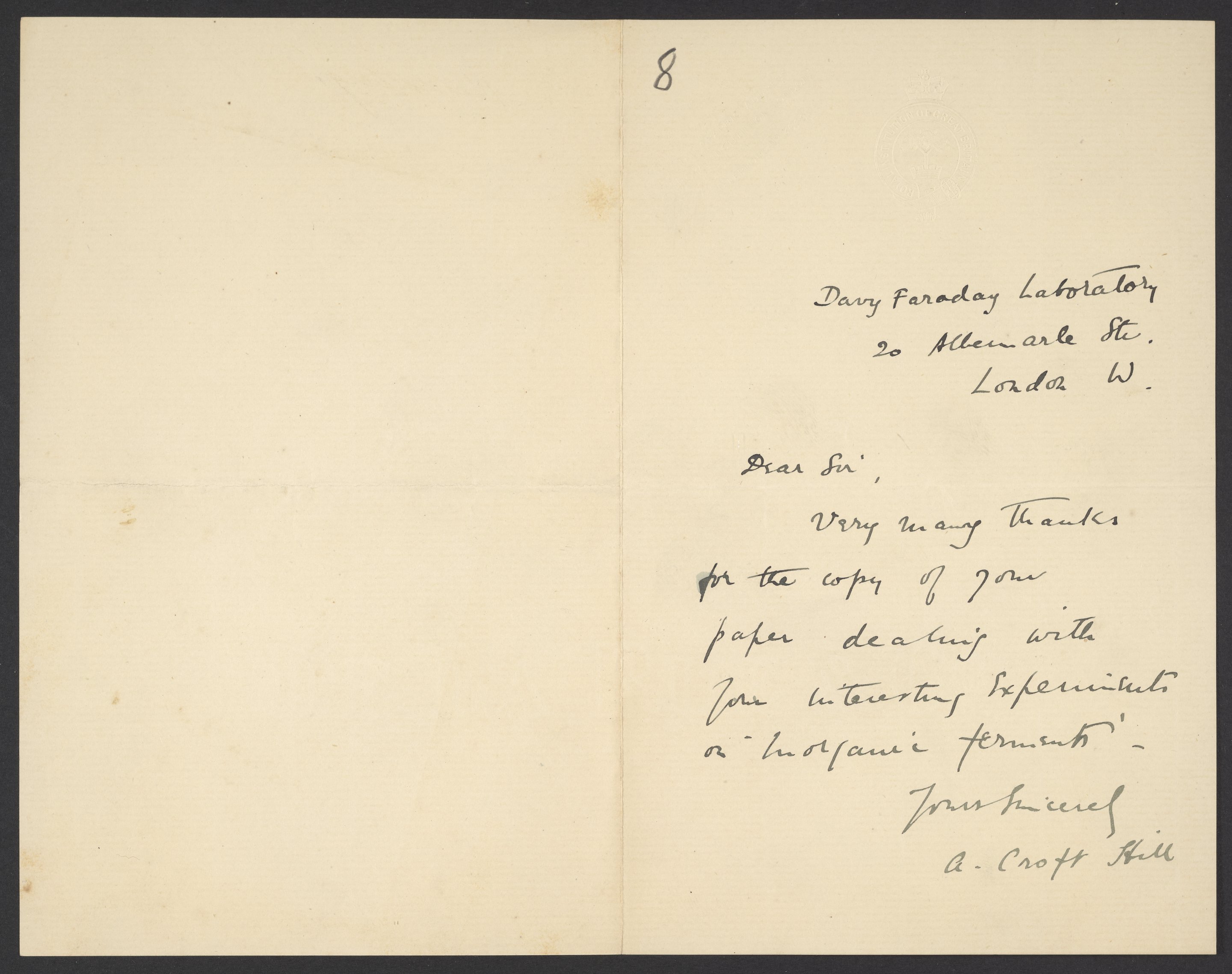 Arthur Croft Hill (1863-?), a chemist in the Davy Faraday Research Laboratory of the Royal Institution, thanks Georg Bredig (1868-1944) for a copy of his paper on inorganic ferments.