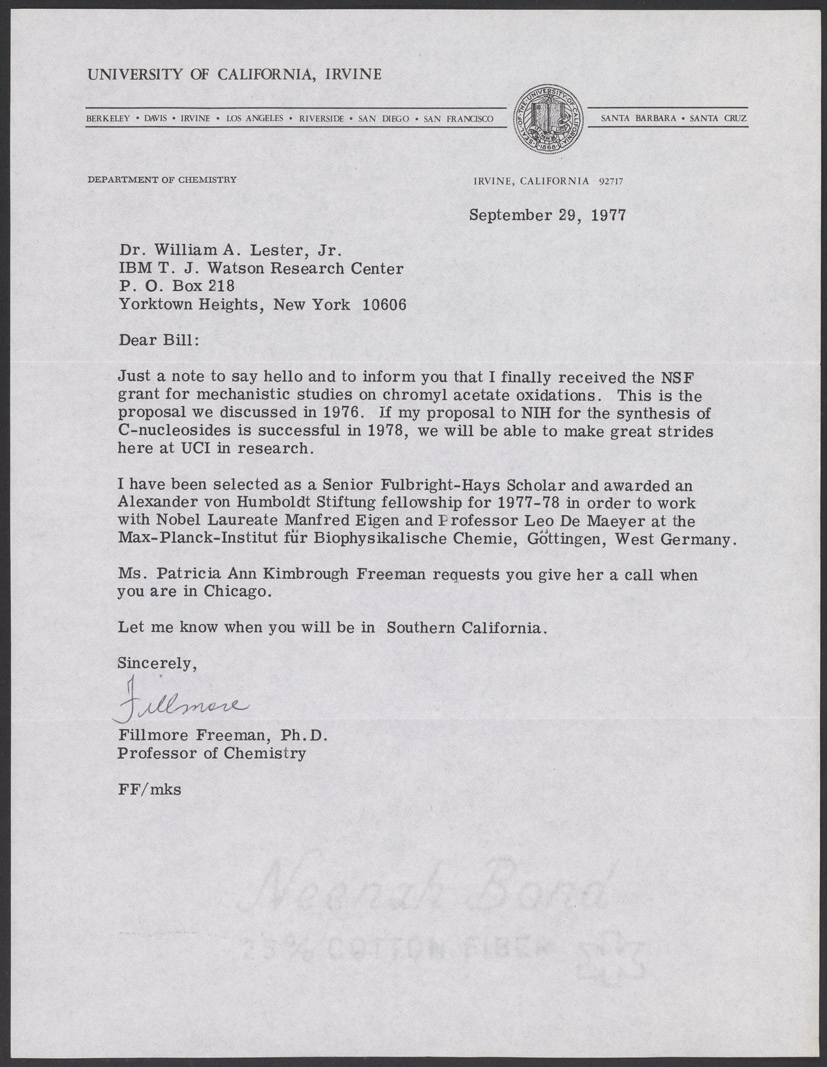 Freeman, Fillmore. “Letter to William A. Lester, Jr. from Fillmore Freeman, September 29, 1977,” September 29, 1977. William A. Lester, Jr. Papers, Box 1, Folder 28. Science History Institute. Philadelphia. https://digital.sciencehistory.org/works/lroxg9m.