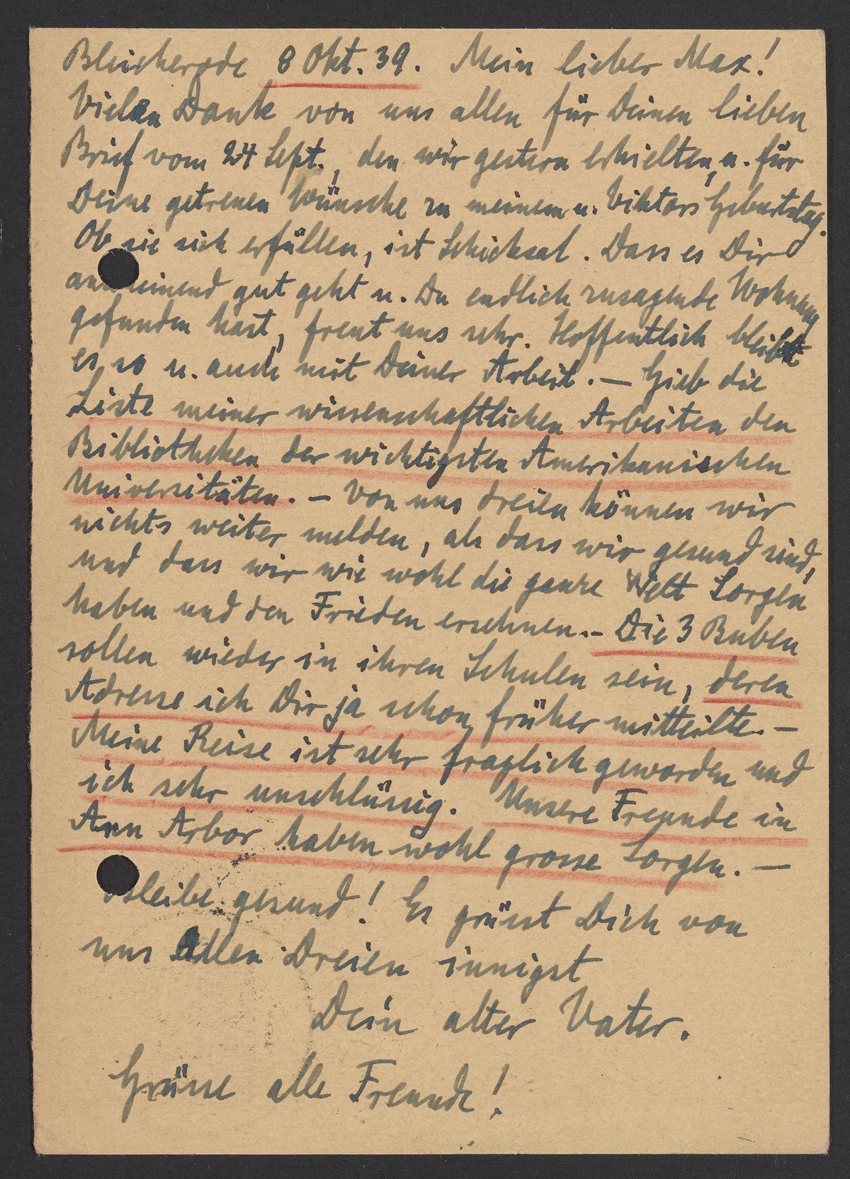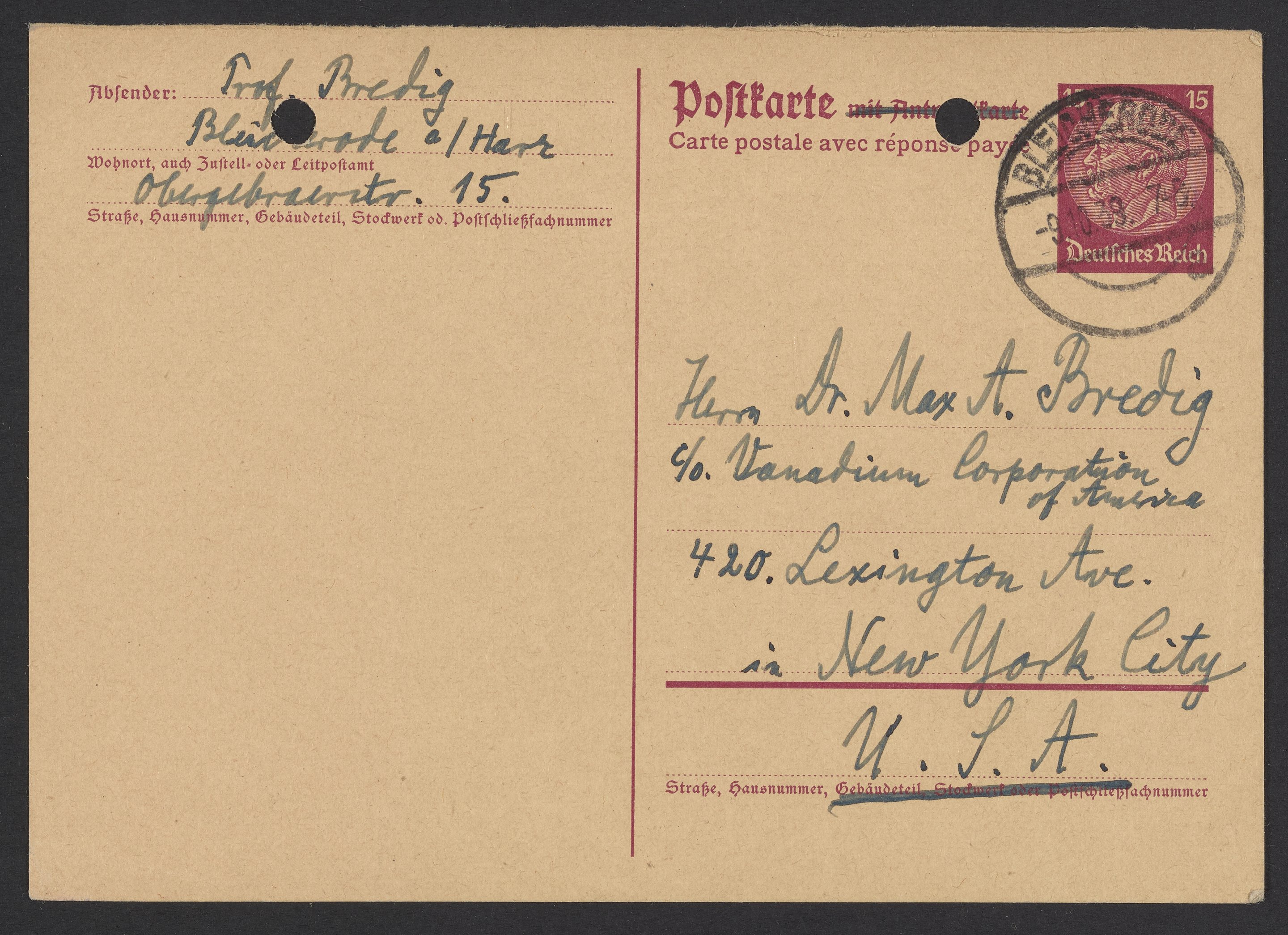 Postcard from Georg Bredig to Max Bredig, October 8, 1939
