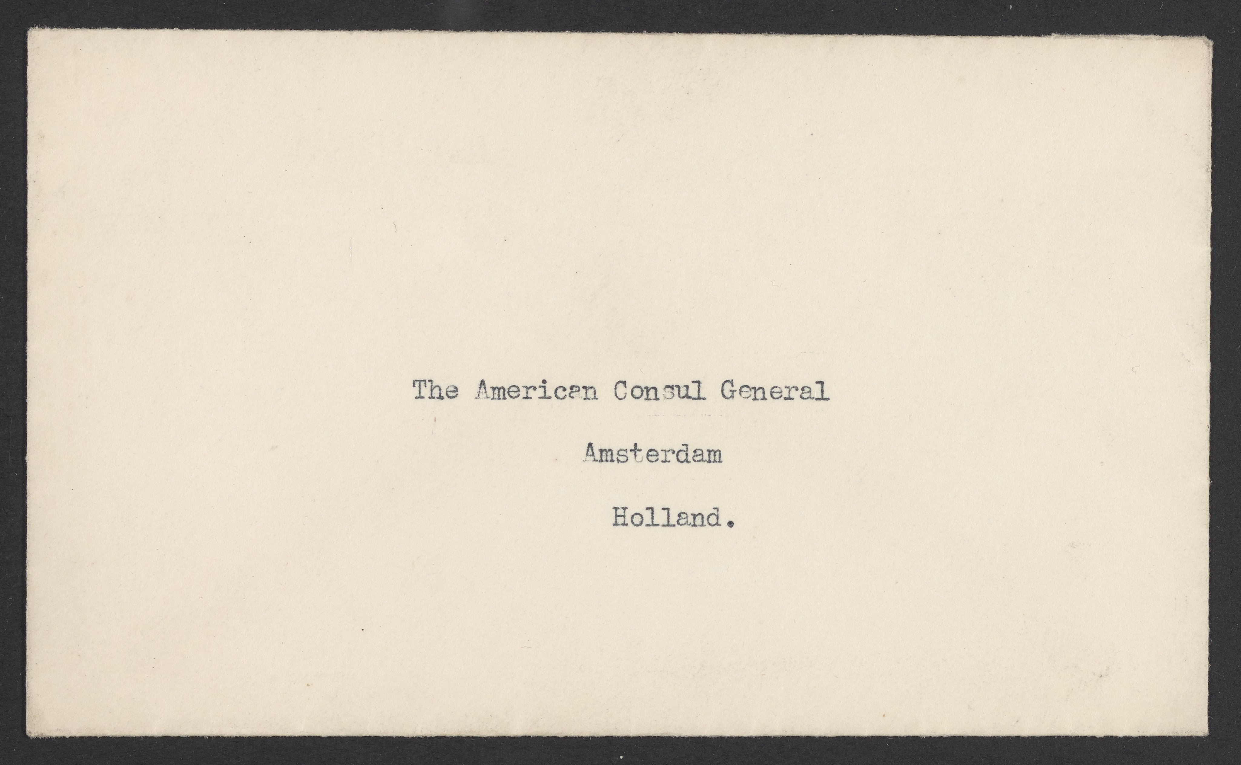 Small JPG1200 x 739px — 76.6 KBLarge JPG2880 x 1775px — 538 KBFull-sized JPG4099 x 2526px — 1.1 MBOriginal fileTIFF — 4099 x 2526px — 29.7 MBEnvelope addressed to The American Consul, Amsterdam, Holland.
