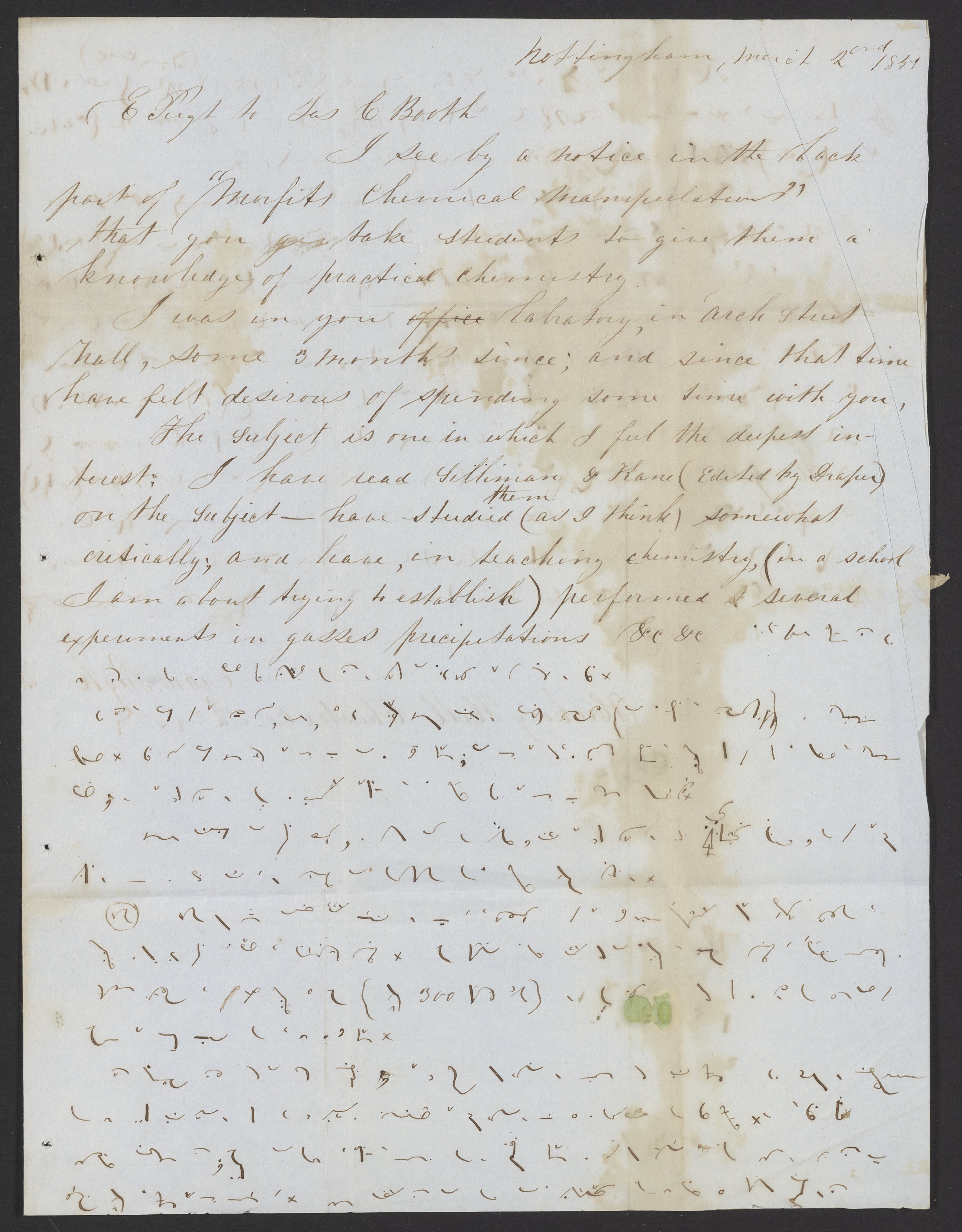 Pugh, Evan. “Letter from Evan Pugh to James Curtis Booth,” March 2, 1851. Papers of James Curtis Booth, Box 1, Folder 6. Science History Institute. Philadelphia. https://digital.sciencehistory.org/works/lwg04s8.