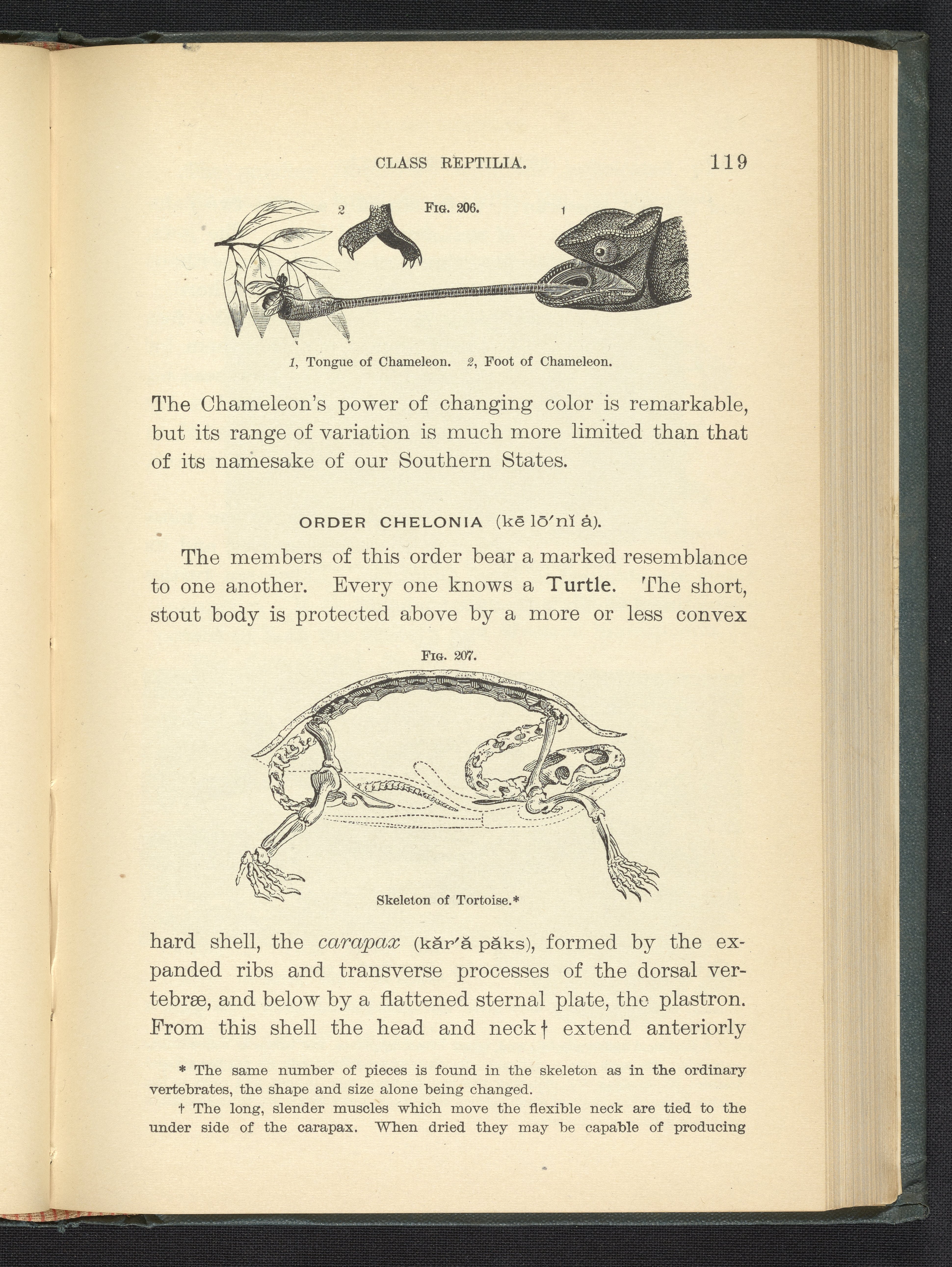 Steele, Joel Dorman, and Jenks, J. W. P. (John Whipple Potter). “Figure 206. Tongue and Foot of Chameleon. Figure 207. Skeleton of Tortoise.” Popular Zoology. New York, New York: Chautauqua Press, 1887. https://digital.sciencehistory.org/works/lynfg8u.