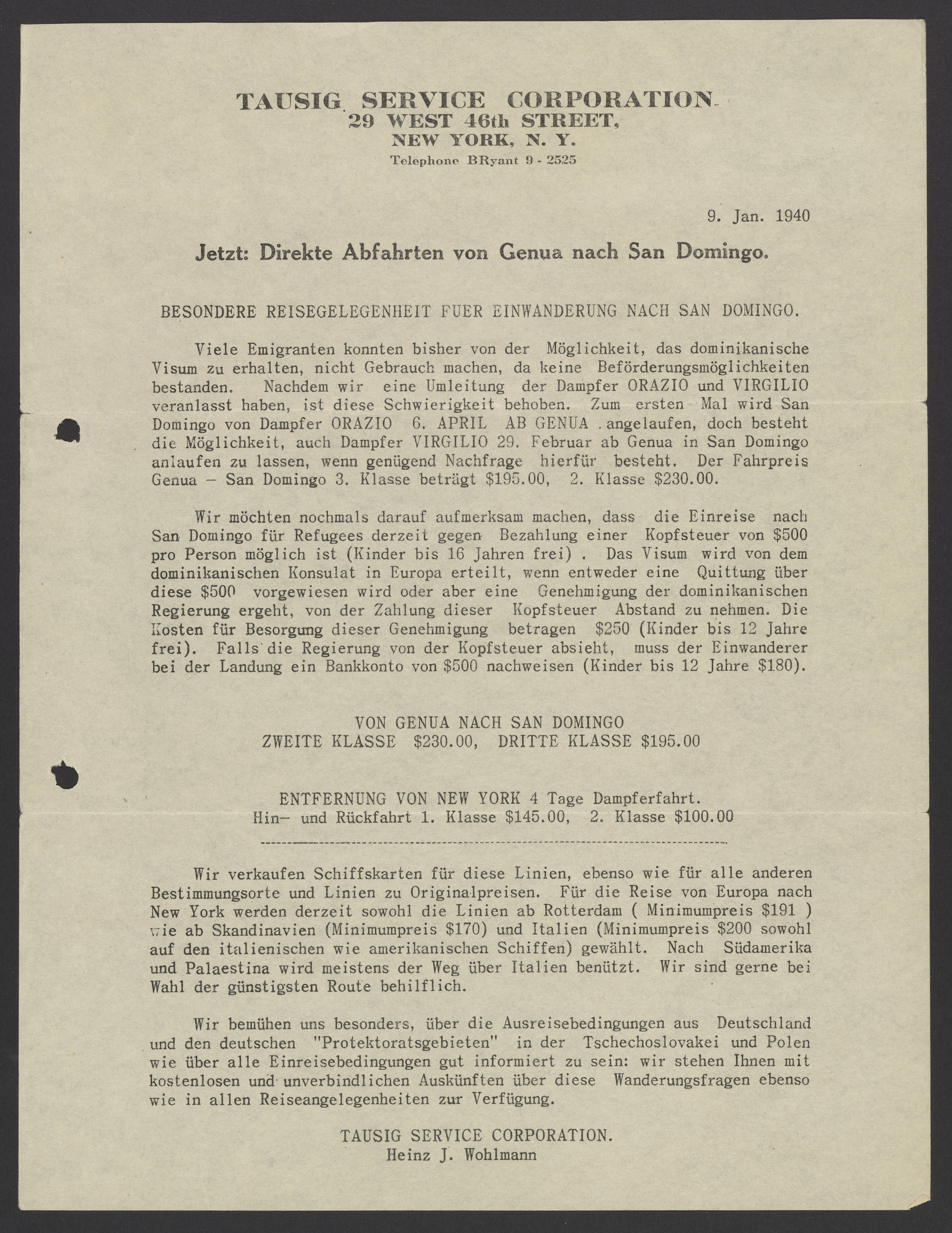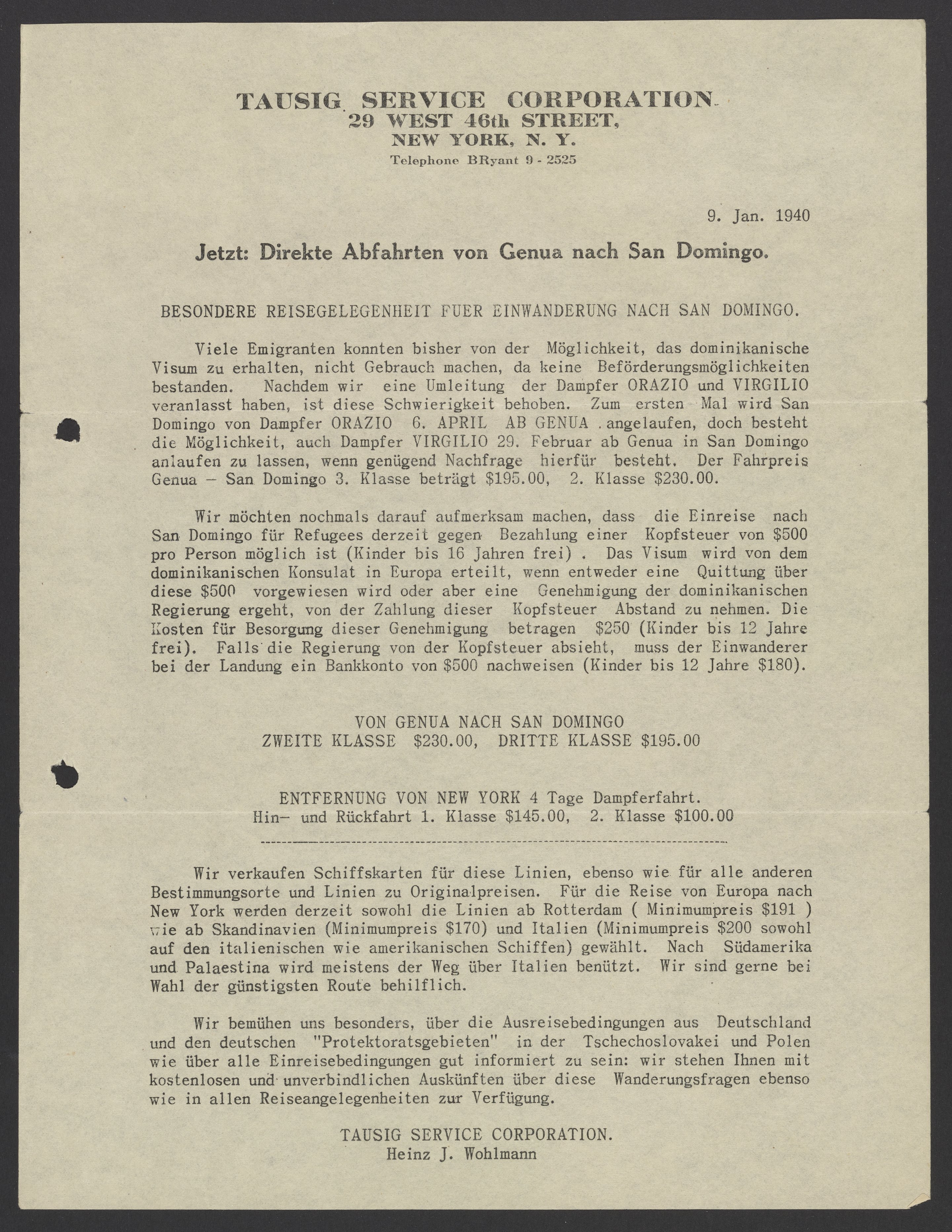 Tausig Service Corporation. “Jetzt: Direkte Abfahrten Von Genua Nach San Domingo,” January 9, 1940. Papers of Georg and Max Bredig, Box 10, Folder 30. Science History Institute. Philadelphia. https://digital.sciencehistory.org/works/lyssmup.