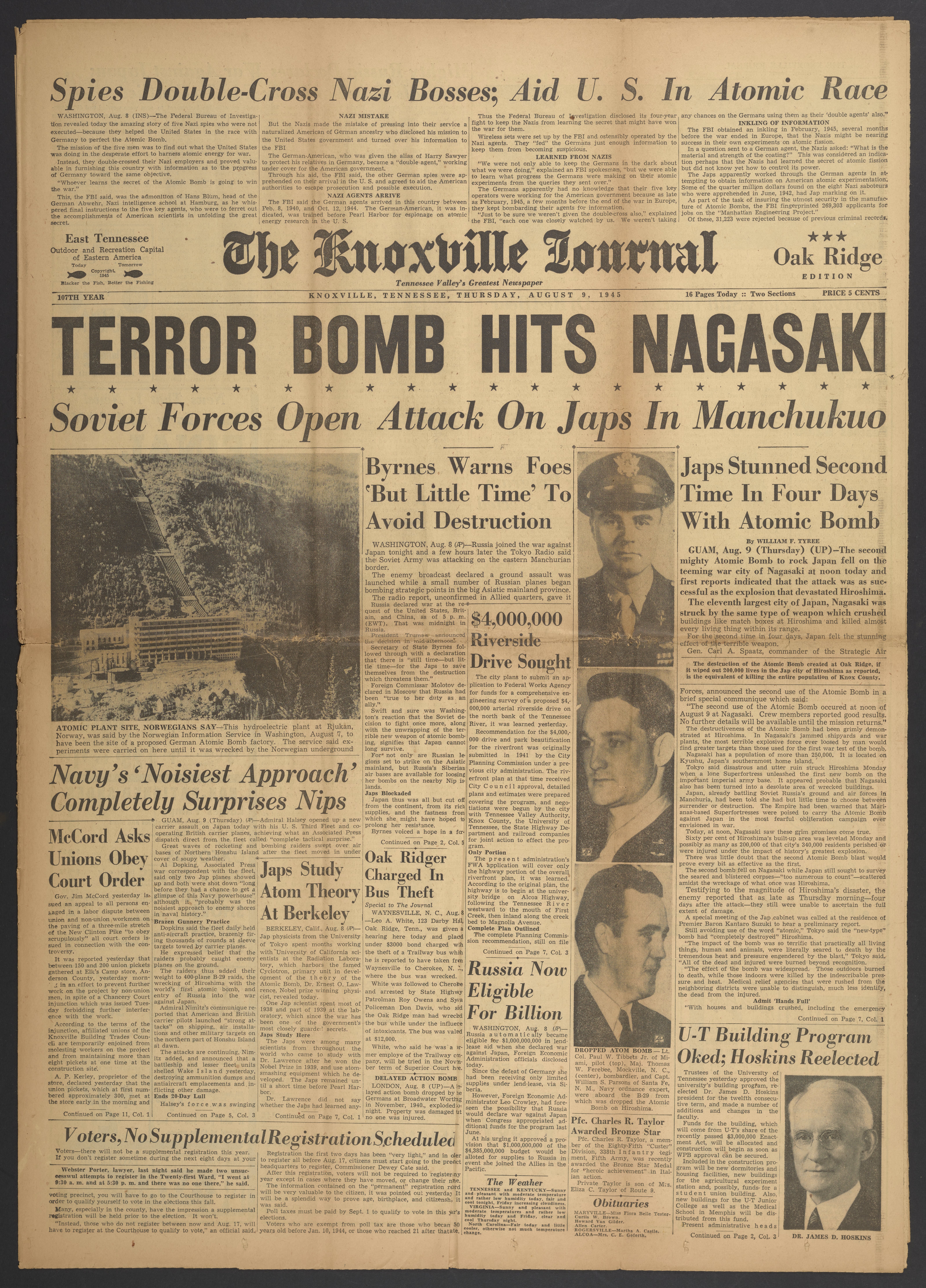 Front page of the August 9, 1945 issue of The Knoxville Journal with the headline "Terror Bomb Hits Nagasaki." The page has articles relating to the dropping of the second atomic bomb on Nagasaki; and Japan and Soviets attacking the Japanese in Manchukuo, now known as Manchuria. Notably, racist ethnic slurs are used to refer to the Japanese in a featured article. The use of these words reflects the heightened anti-Japanese sentiments that were fueled by World War II.