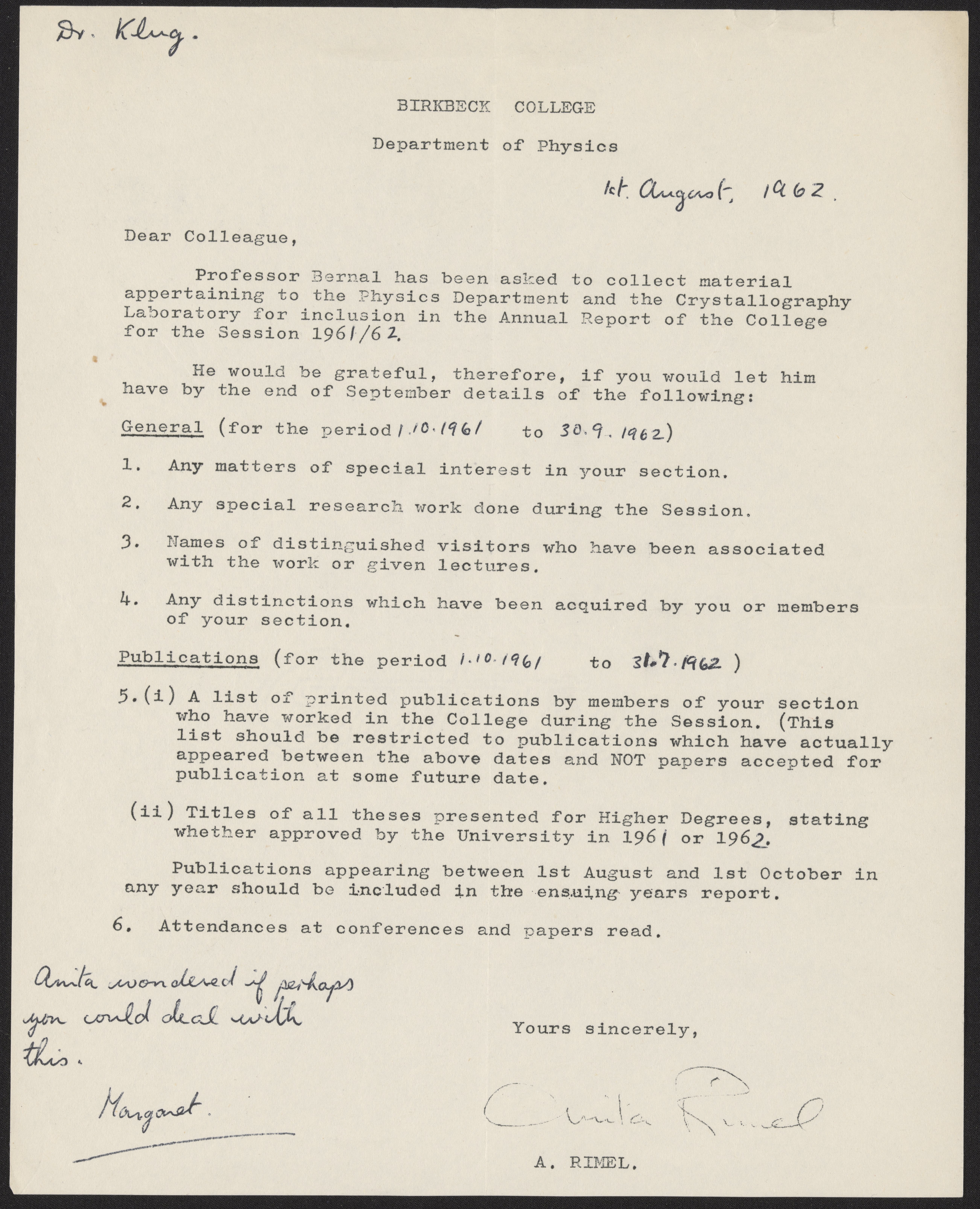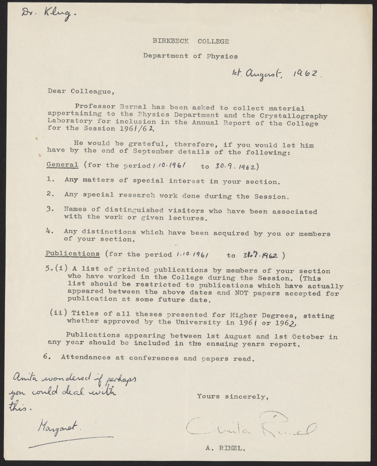 Rimel, Anita. “Memo from Anita Rimel to Aaron Klug, August 1st, 1962,” August 1, 1962. History of Molecular Biology Collection, Box 17, Folder 12. Science History Institute. Philadelphia. https://digital.sciencehistory.org/works/lzteiu8.