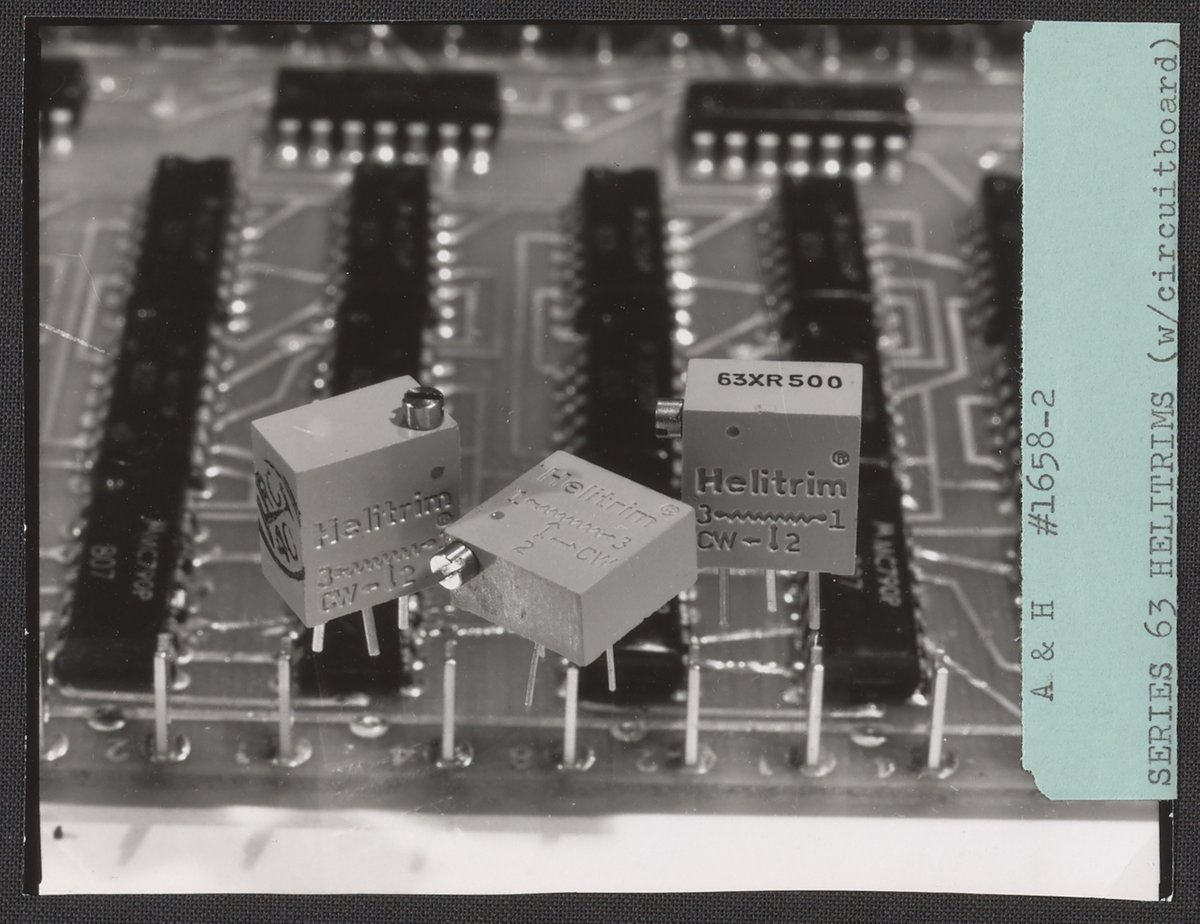 Armstrong & Hess. “Helipot Series 63 Helitrim Trimming Potentiometers with Circuit Board,” 1950–1969. Beckman Historical Collection, Box 85. Science History Institute. Philadelphia. https://digital.sciencehistory.org/works/m326m2061.
