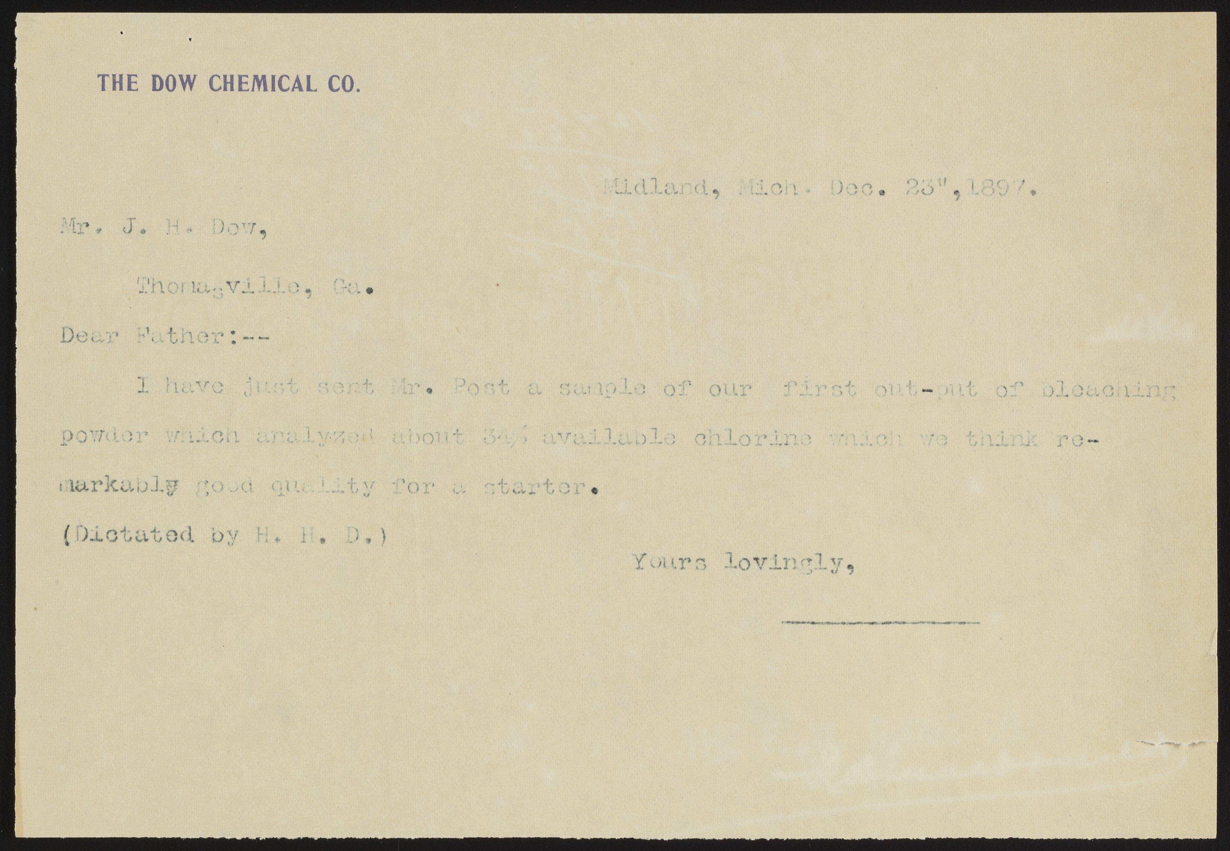 Dow, Herbert Henry. “Telegram from Herbert H. Dow to Joseph H. Dow, December 23, 1897,” December 23, 1897. Papers of Herbert H. Dow, Box 10, Folder 970001. Science History Institute. Philadelphia. https://digital.sciencehistory.org/works/m326m2699.