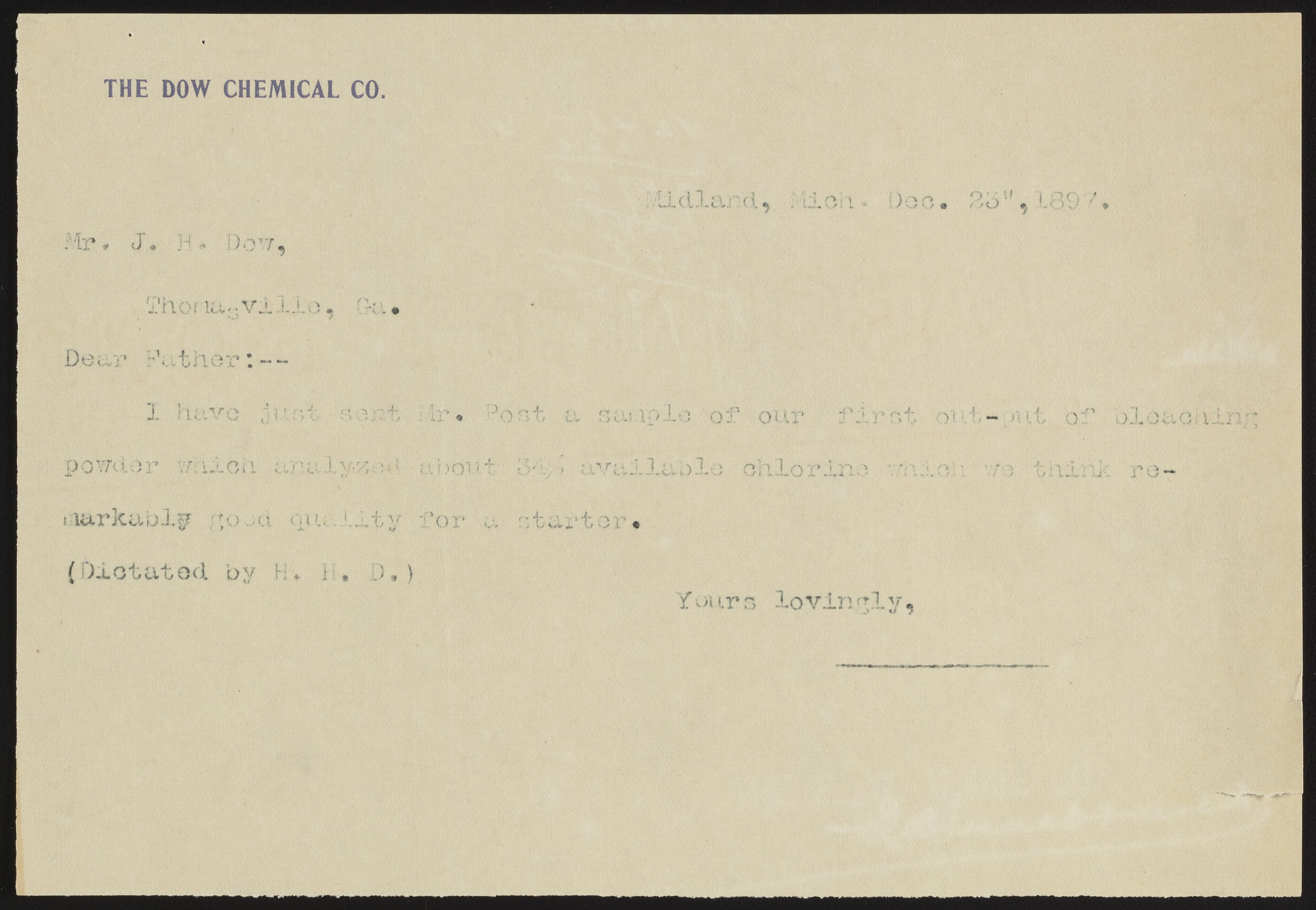 Telegram from Herbert H. Dow to Joseph H. Dow, December 23, 1897