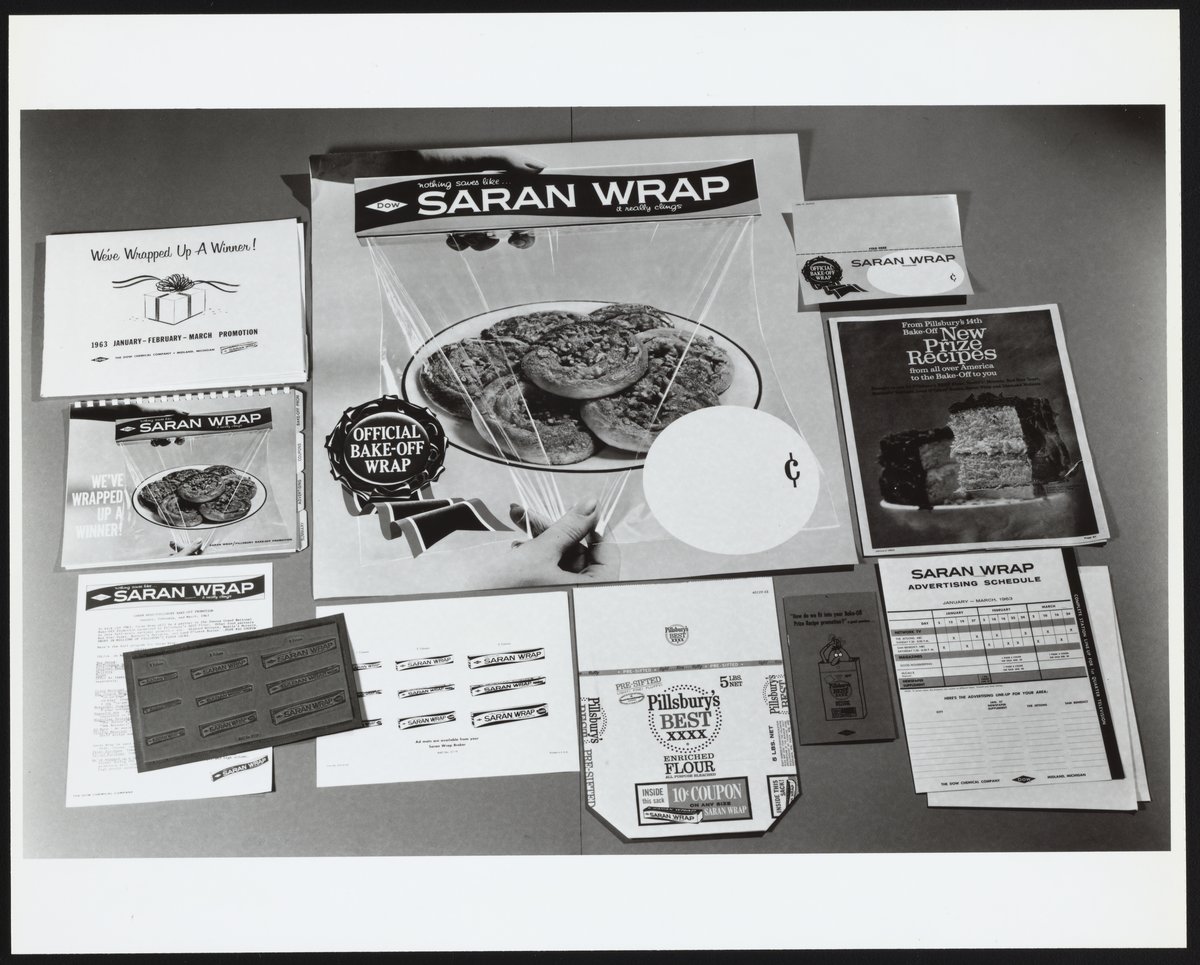 General view of assorted marketing materials for Dow Saran Wrap, including an advertising schedule and promotional tie-ins related to the Pillsbury Bake-off. Initially developed for the U.S. Army to wrap arms and equipment for transport during World War II, saran plastic was subsequently developed and marketed as Saran Wrap for household use.