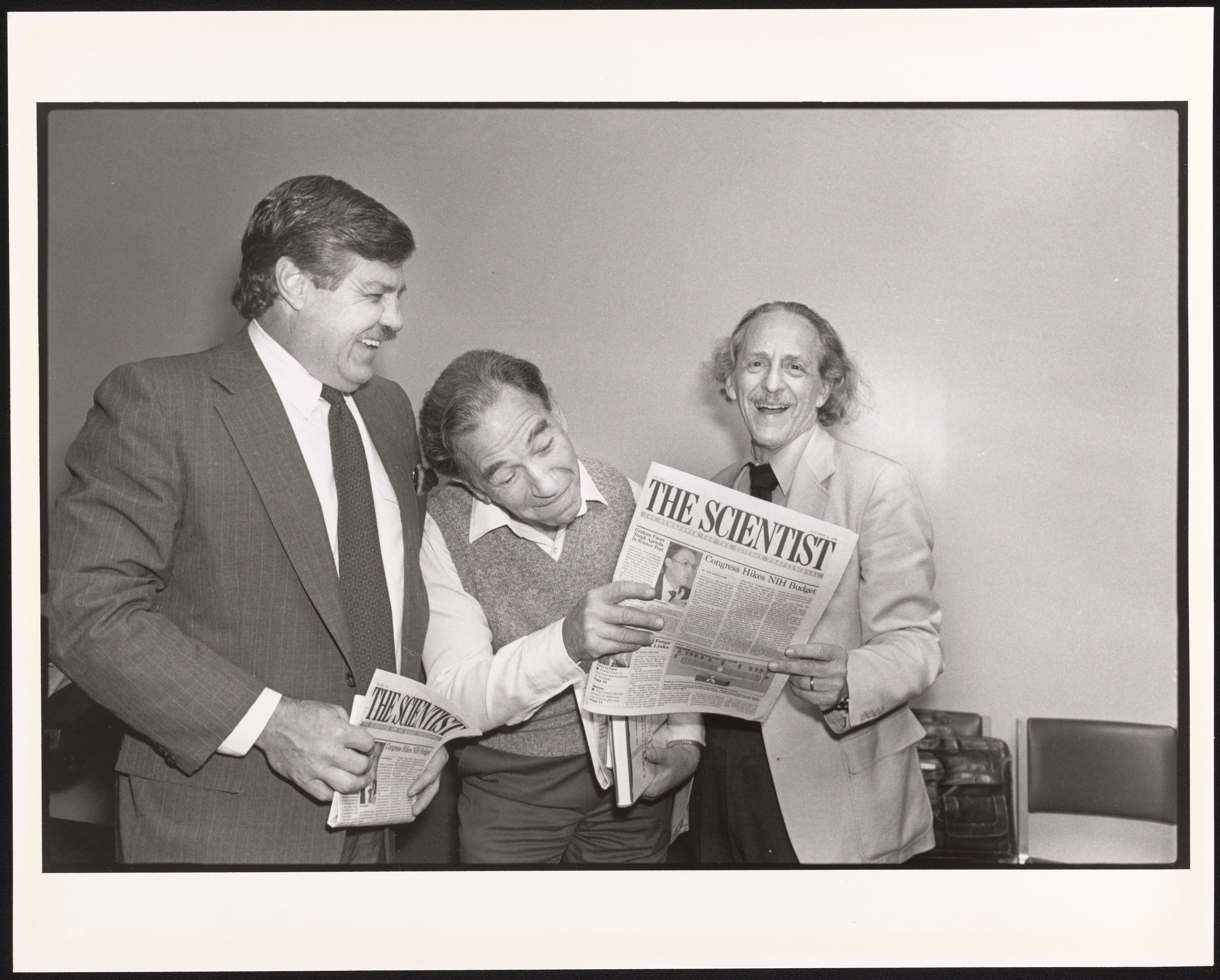 Benson, Neil. “Roland Holub, Stanley Cohen, and Eugene Garfield Holding the First Issues of ‘The Scientist,’” October 1986. Eugene Garfield Papers. Science History Institute. Philadelphia. https://digital.sciencehistory.org/works/m3qd7ii.
