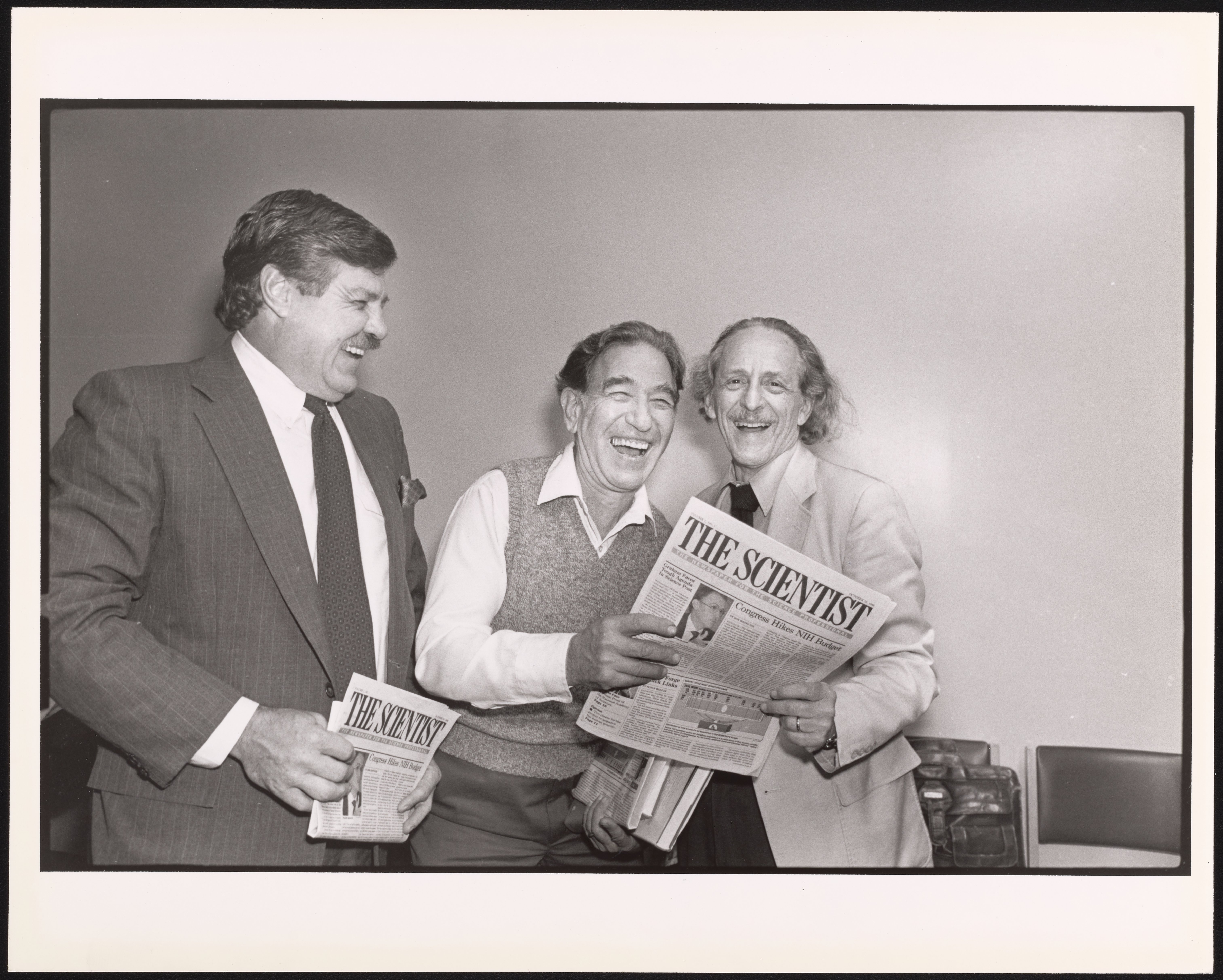 Benson, Neil. “Roland Holub, Stanley Cohen, and Eugene Garfield Holding the First Issues of ‘The Scientist,’” October 1986. Eugene Garfield Papers. Science History Institute. Philadelphia. https://digital.sciencehistory.org/works/m3qd7ii.