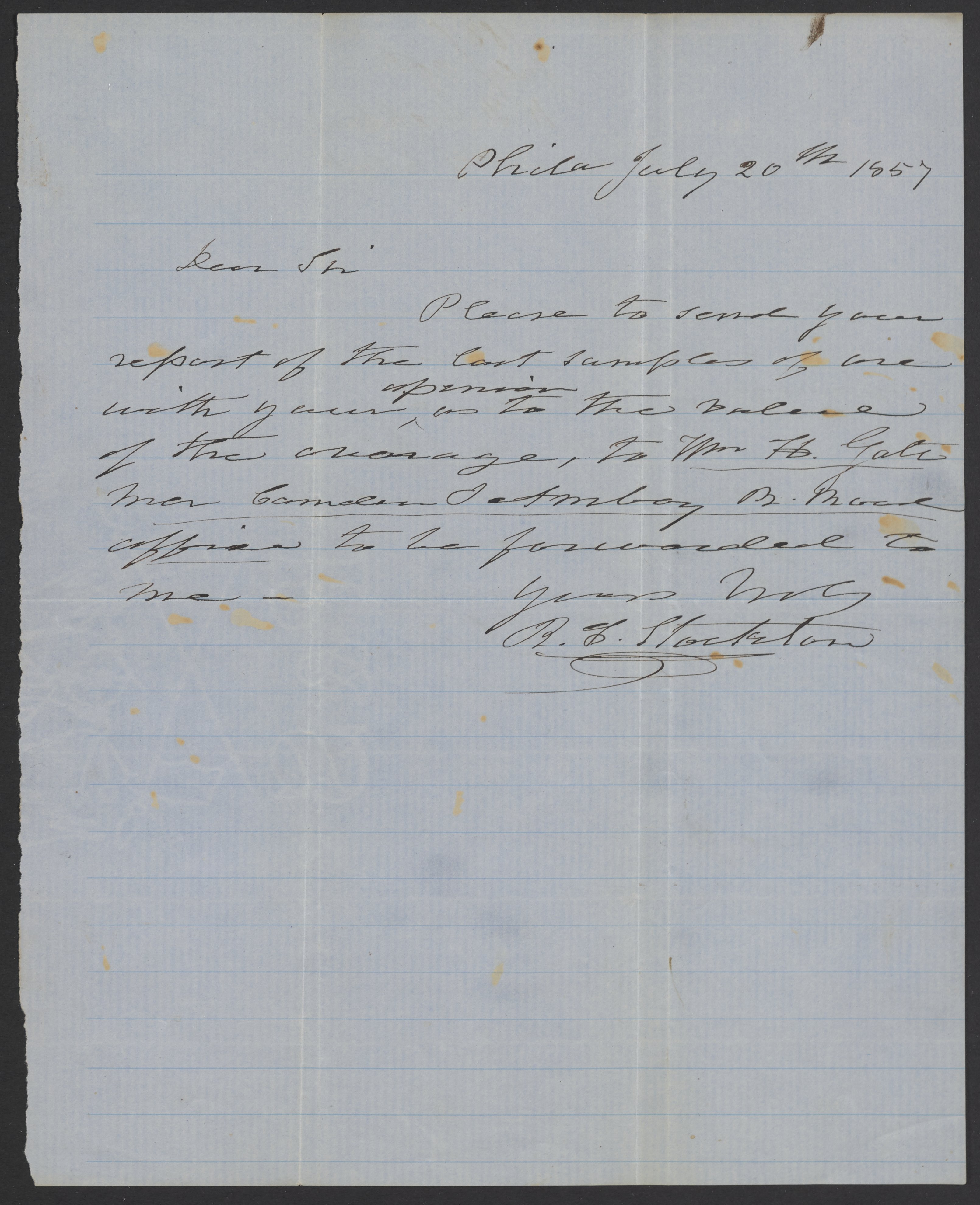 Letter from R. F. Stockton to James Curtis Booth, July 20, 1857