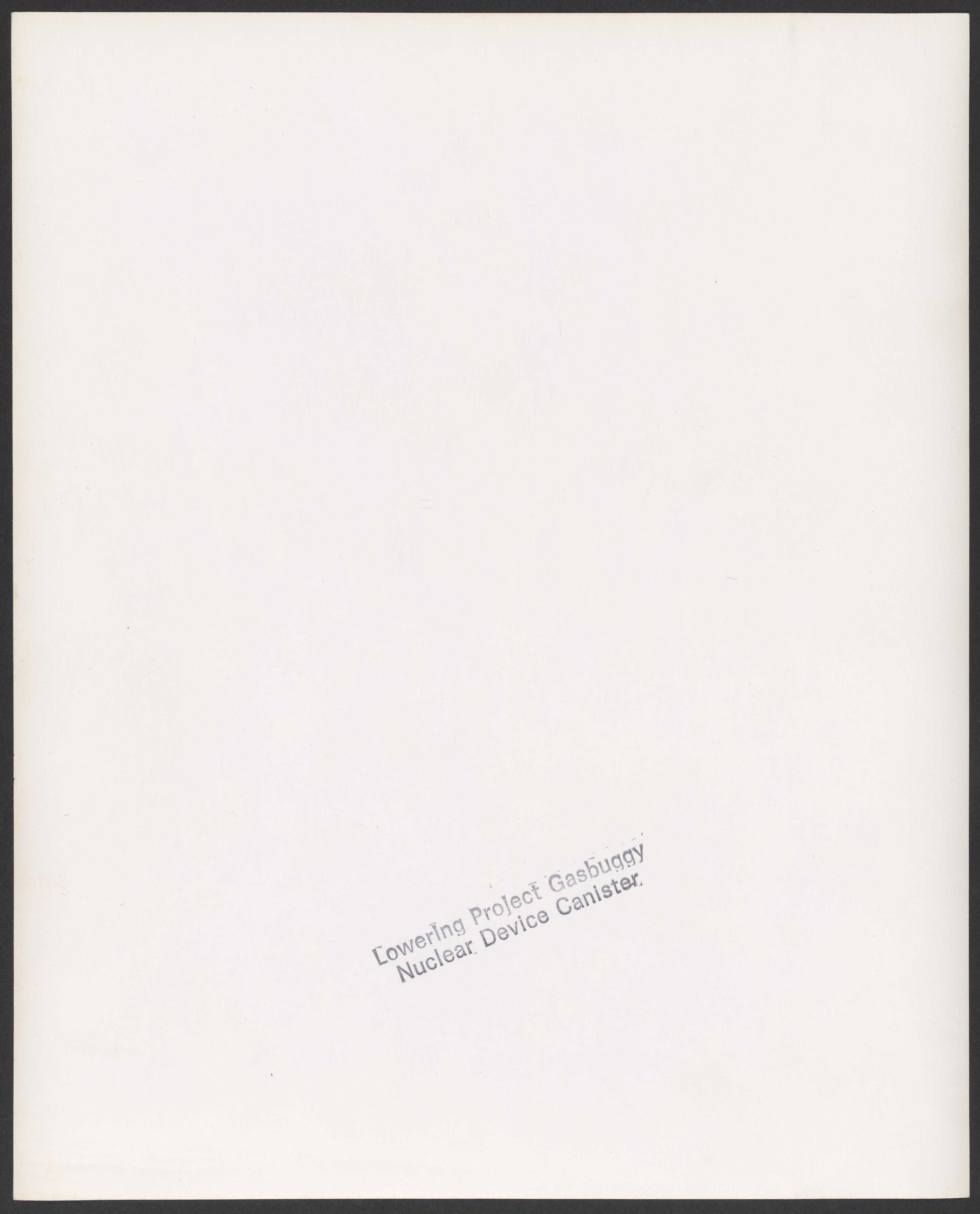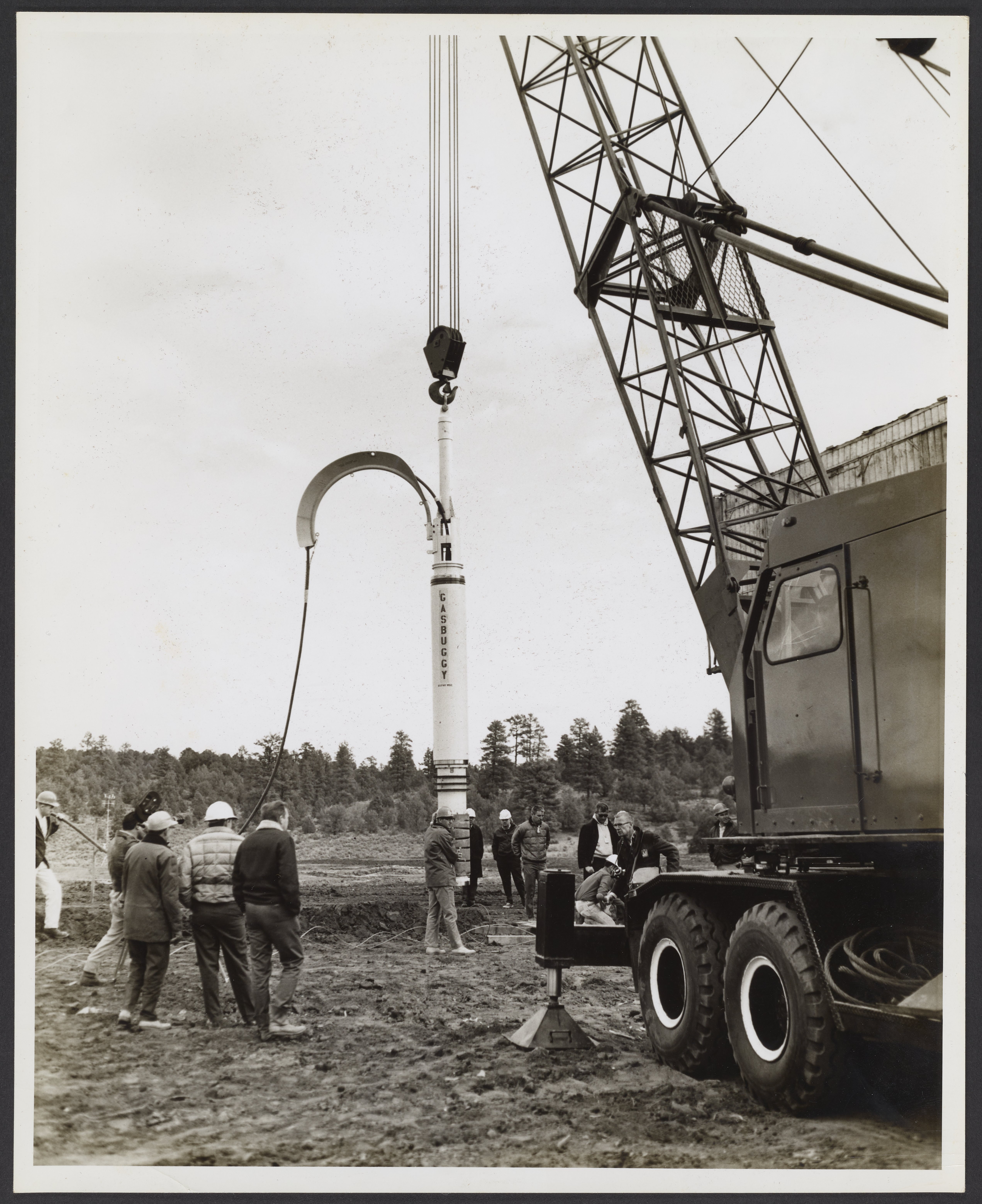 Small JPG1200 x 1472px — 266 KBLarge JPG2880 x 3532px — 1.1 MBFull-sized JPG5086 x 6238px — 2.9 MBOriginal fileTIFF — 5086 x 6238px — 90.8 MBBlack and white photograph showing the Project Gasbuggy nuclear device canister being lowered into the ground.