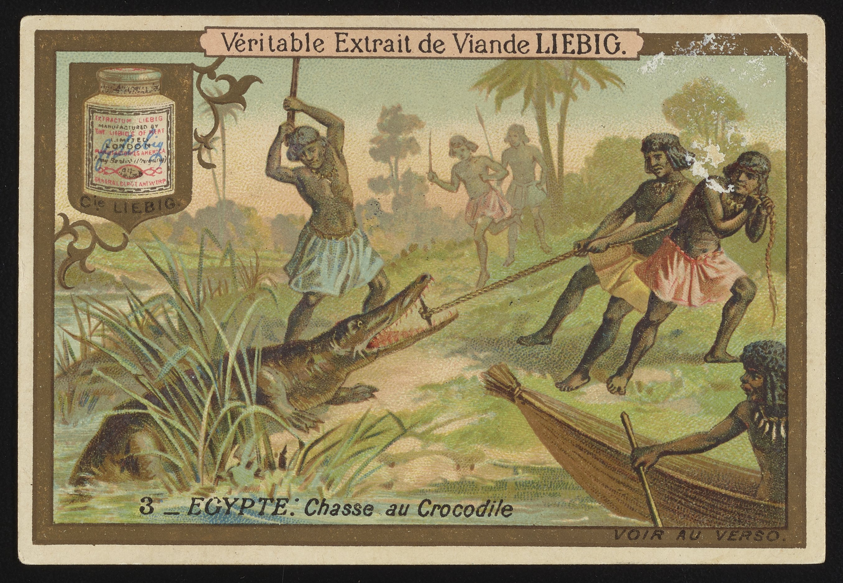 Small JPG1200 x 830px — 257 KBFull-sized JPG2710 x 1875px — 1.0 MBOriginal fileTIFF — 2710 x 1875px — 14.6 MBEntitled "Egypte. Chasse au Crocodile," illustrated trade card depicts men hunting a crocodile in the Egyptian wilderness. The imagery could be referencing European adventurer Sir Henry Morton Stanley's 1887 visit to Egypt, who mentioned bringing the extract on an earlier journey to Africa. The upper left hand corner depicts a jar of Real Liebig Meat Extract. Verso is an advertisement for Liebig's Extract of Meat.