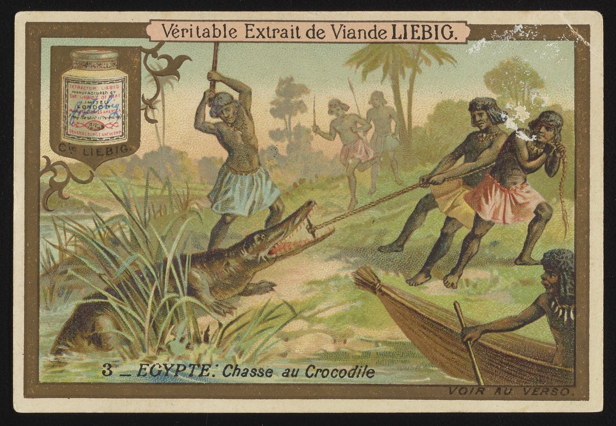 “Trade Card for Véritable Extrait De Viande Liebig [Real Liebig Meat Extract] with Crocodile Chase in Egypt.” Lithographic ink. London, England: Liebig's Extract of Meat Company, 1903. Science History Institute. Philadelphia. https://digital.sciencehistory.org/works/m613mz51x.