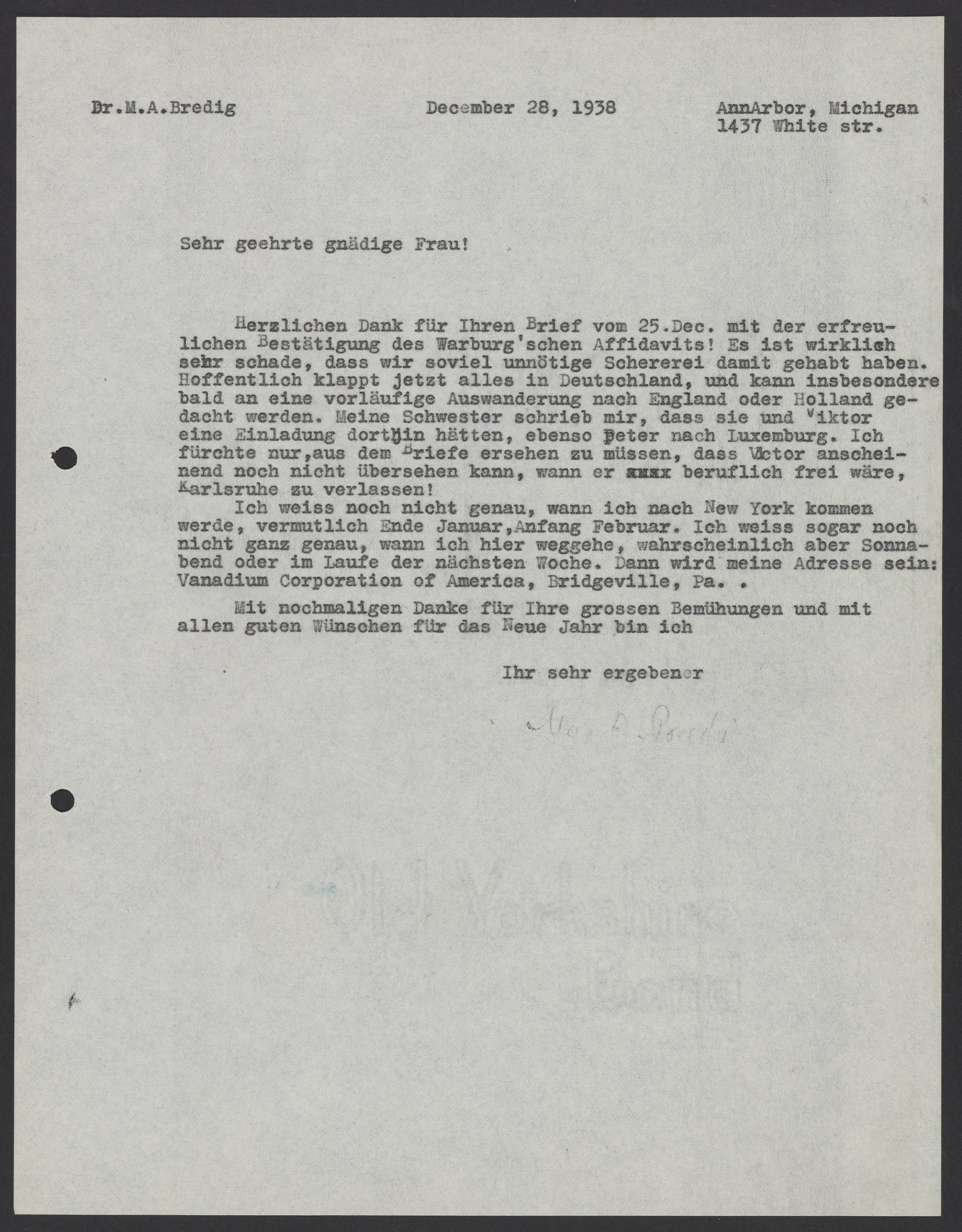 Thank you very much for your letter from December 25th with the favorable confirmation of Warburg’s affidavit! It’s really a shame that we went through so much unnecessary trouble to get it. Hopefully everything will work out now in Germany, and a temporary emigration to England or Holland can soon be considered. My sister wrote that she and Viktor received an invitation there, as did Peter in Luxembourg. According to Viktor’s letter, I fear that he apparently can’t foresee when he would be able to leave Karlsruhe professionally.
