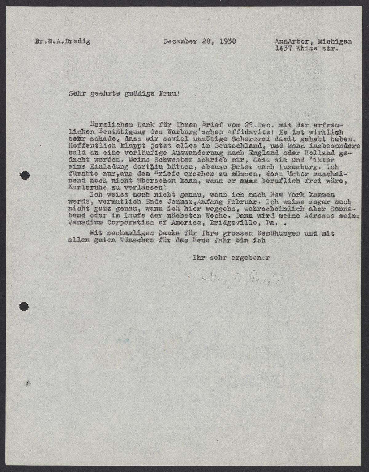 Herzlichen Dank für Ihren Brief vom 25. Dec. Mit der erfreulichen Bestätigung des Warburg’schen Affidavits! Es ist wirklich sehr schade, dass wir soviel unnötige Schererei damit gehabt haben. Hoffentlich klappt jetzt alles in Deutschland, und kann insbesondere bald an eine vorläufige Auswanderung nach England oder Holland gedacht werden. Meine Schwester schrieb, dass sie und Viktor eine Einladung dorthin hätten, ebenso Peter nach Luxemburg. Ich fürchte nur, aus dem Briefe ersehen zu müssen, dass Victor anscheinend noch nicht übersehen kann, wann er beruflich frei wäre, Karlsruhe zu verlassen.
