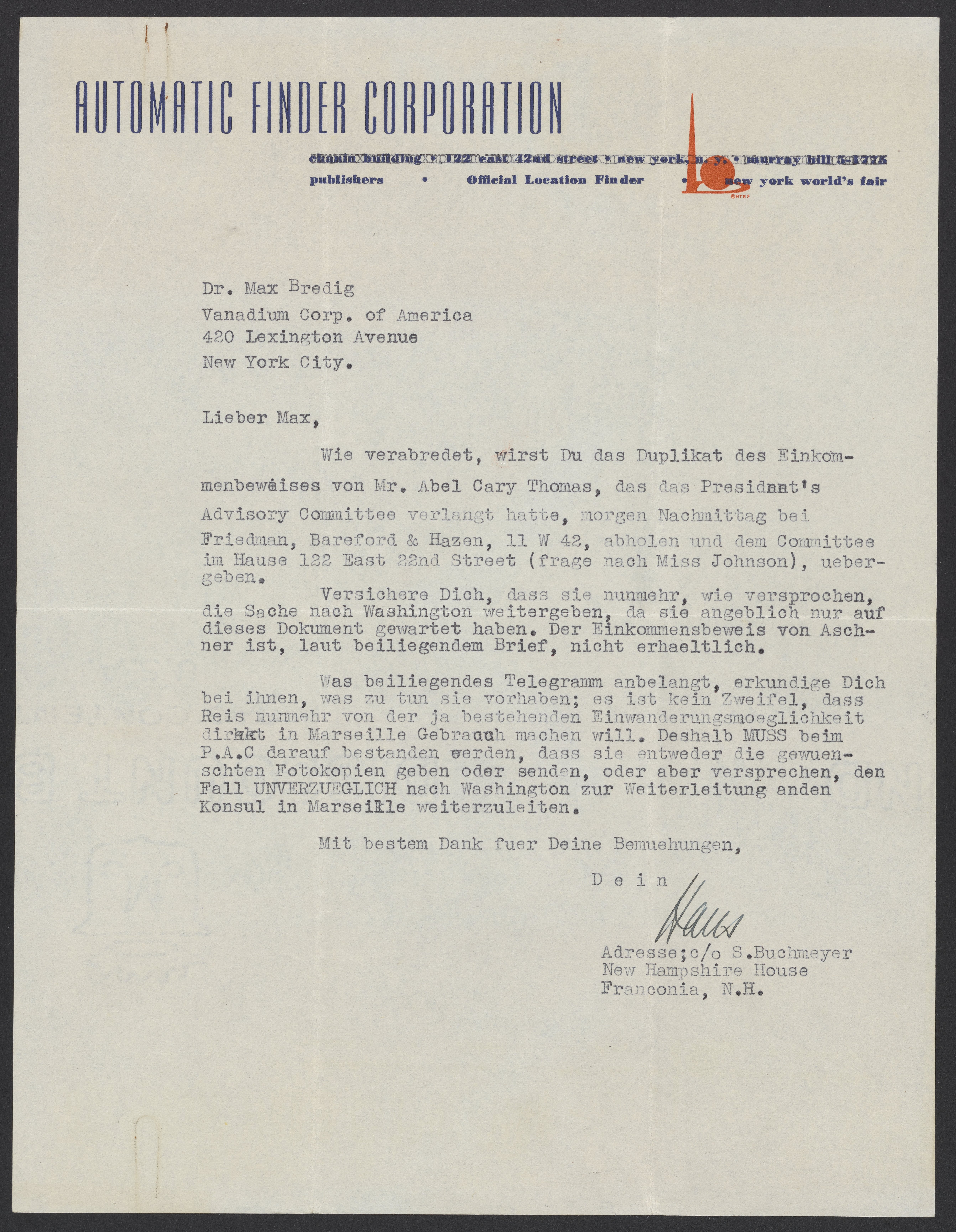 Wie verabredet, wirst Du das Duplikat des Einkommenbeweises von Mr. Abel Cary Thomas, das das President's Advisory Committee verlangt hatte, morgen Nachmittag bei Friedman, Bareford & Hazen, 11 W 42, abholen und dem Committee im Hause 122 East 22nd Street (frage nach Miss Johnson), uebergeben.
