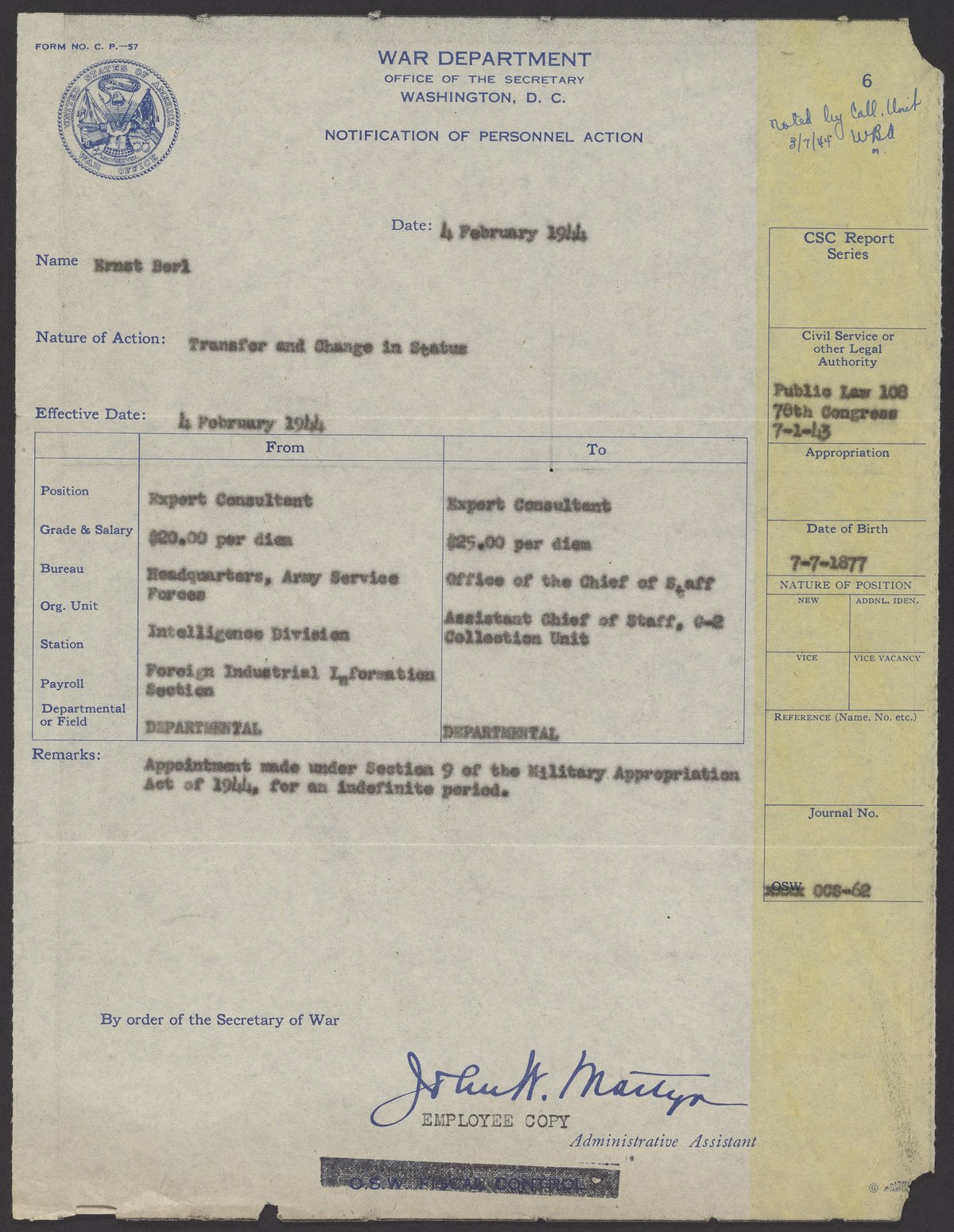 Document notifying Ernst Berl (1877-1946) that he has been transferred from Expert Consultant to the Army Services Force, Intelligence Division, to Expert Consultant, Office of the Chief of Staff.