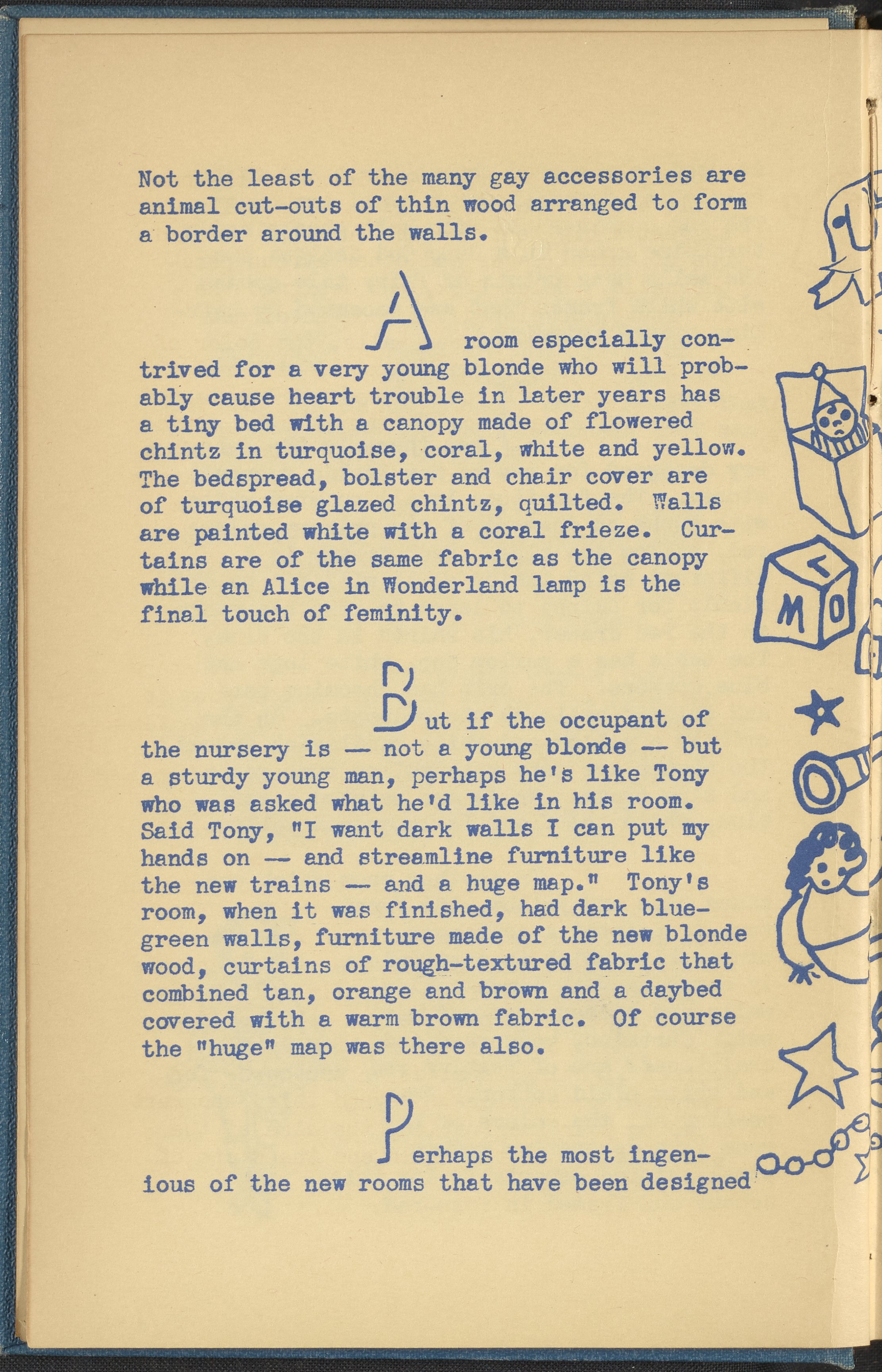 Booklet corresponding to a radio broadcast program created by the National Paint, Varnish, and Lacquer Association. The booklet discusses trends for nursery and children's bedroom decoration. Describes several nurseries with varying design elements and themes for inspiration. Then, provides tips for remodeling a child's bedroom on a budget. Includes small stylized illustrations throughout and decorated covers.