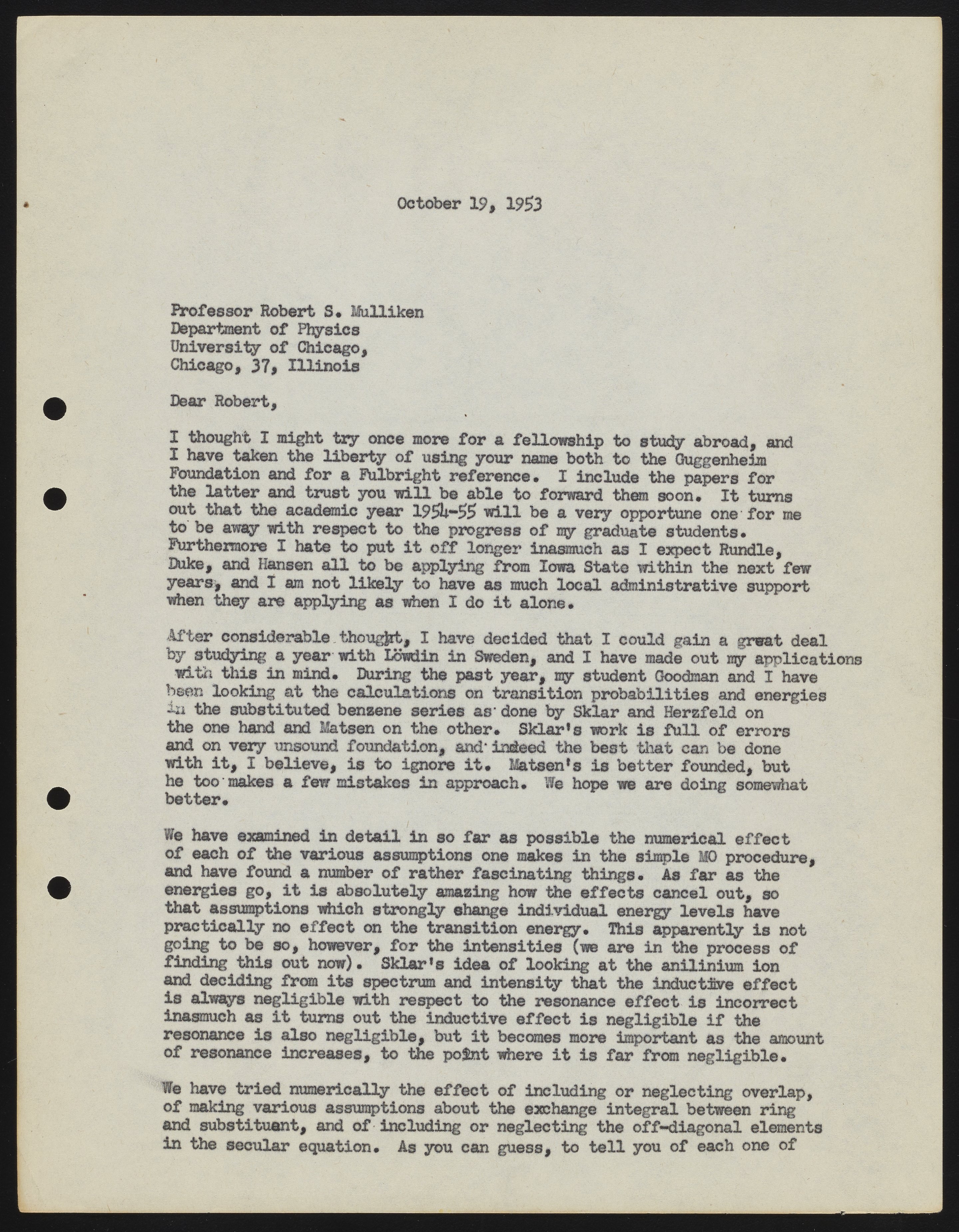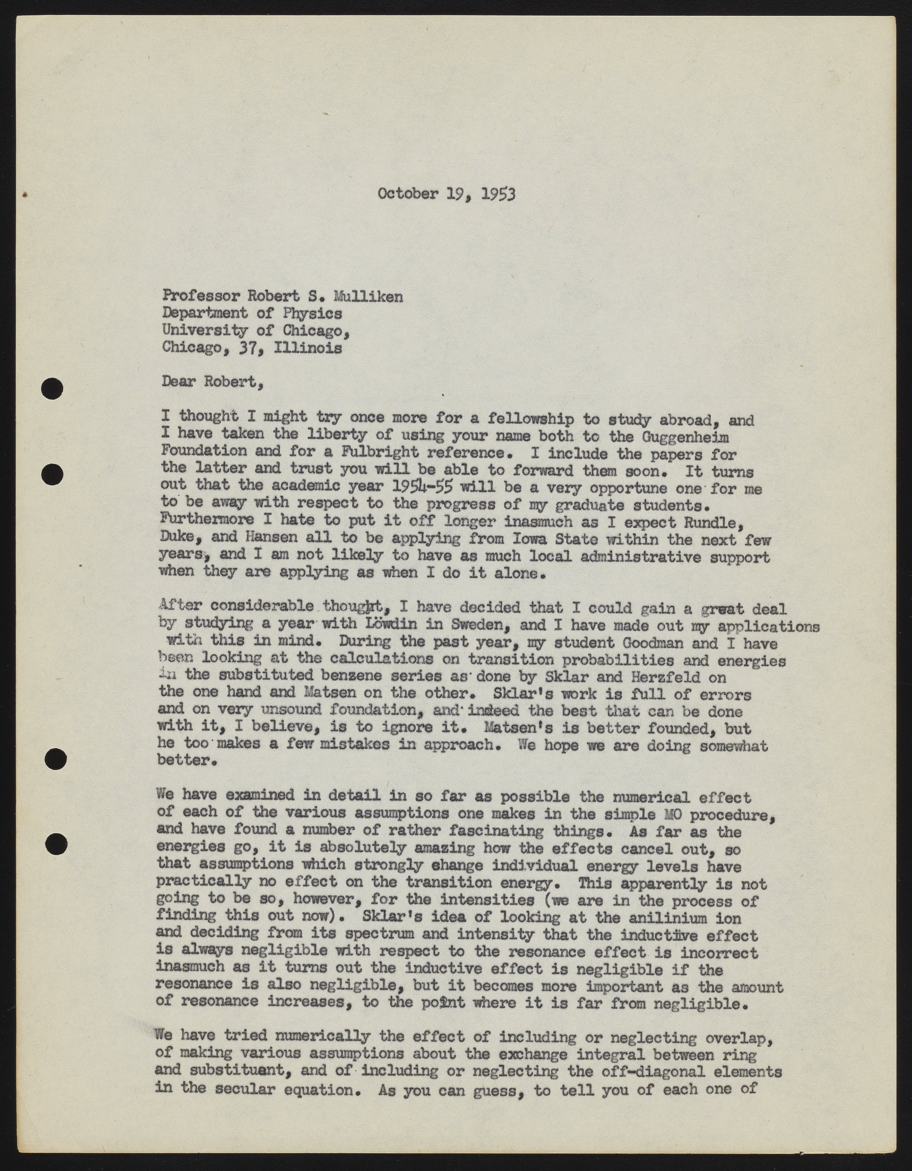 Letter from Harrison Shull to Robert S. Mulliken, 1953