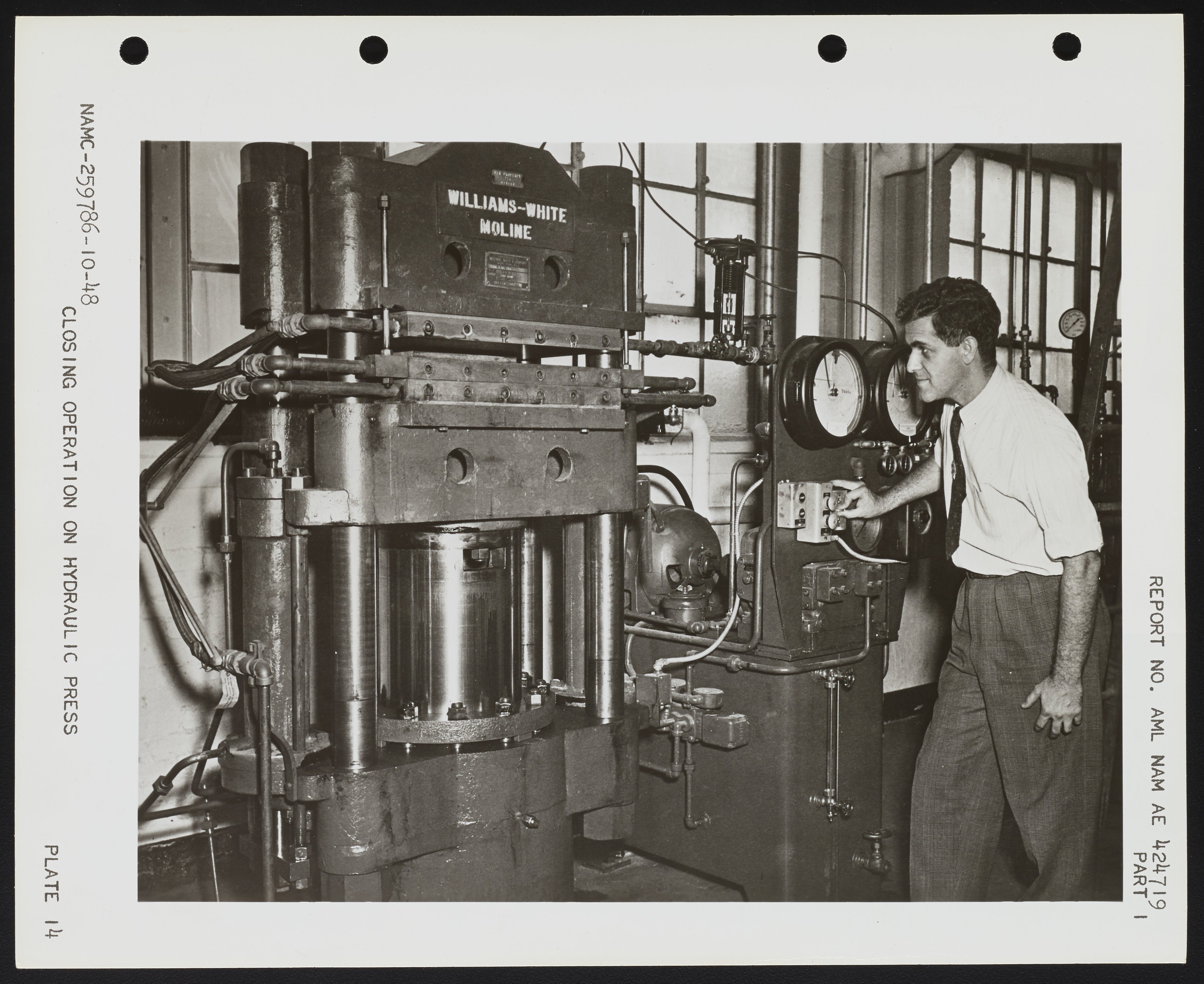 Naval Air Experimental Station, and United States. Navy. “Closing Operation on Hydraulic Press,” circa 1949. Photographs from the Papers of J. Hartley Bowen, Box 1. Science History Institute. Philadelphia. https://digital.sciencehistory.org/works/mc87pq29x.