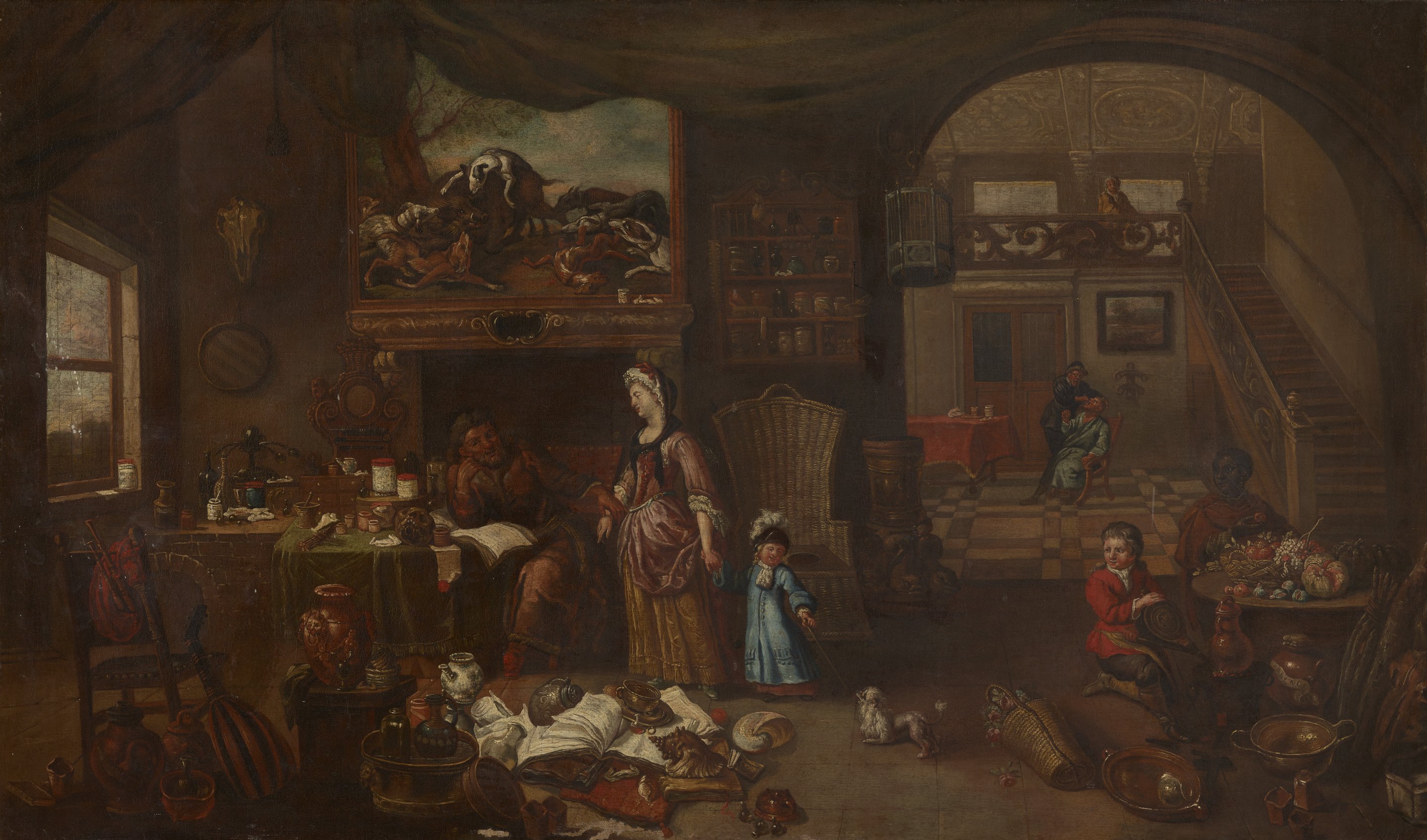An alchemist takes the pulse of an elegant female patient, inside a cavernous chamber decorated with fine paintings and luxurious furnishings. Above the mantle hangs a painted hunting scene which resembles the work of Peter Paul Rubens, one of the 17th century's most acclaimed artists. In this rich interior small red-lidded apothecary's jars mingle with musical instruments, marble urns, books, shells, and mirrors. At right, a young assistant in a red coat works a hand-bellows to heat a small distillation apparatus. Beside him, a young boy of African descent plucks a piece of fruit from an overflowing basket. Far in the background, in a tiled room beside a staircase, a dentist examines the teeth of a male patient.