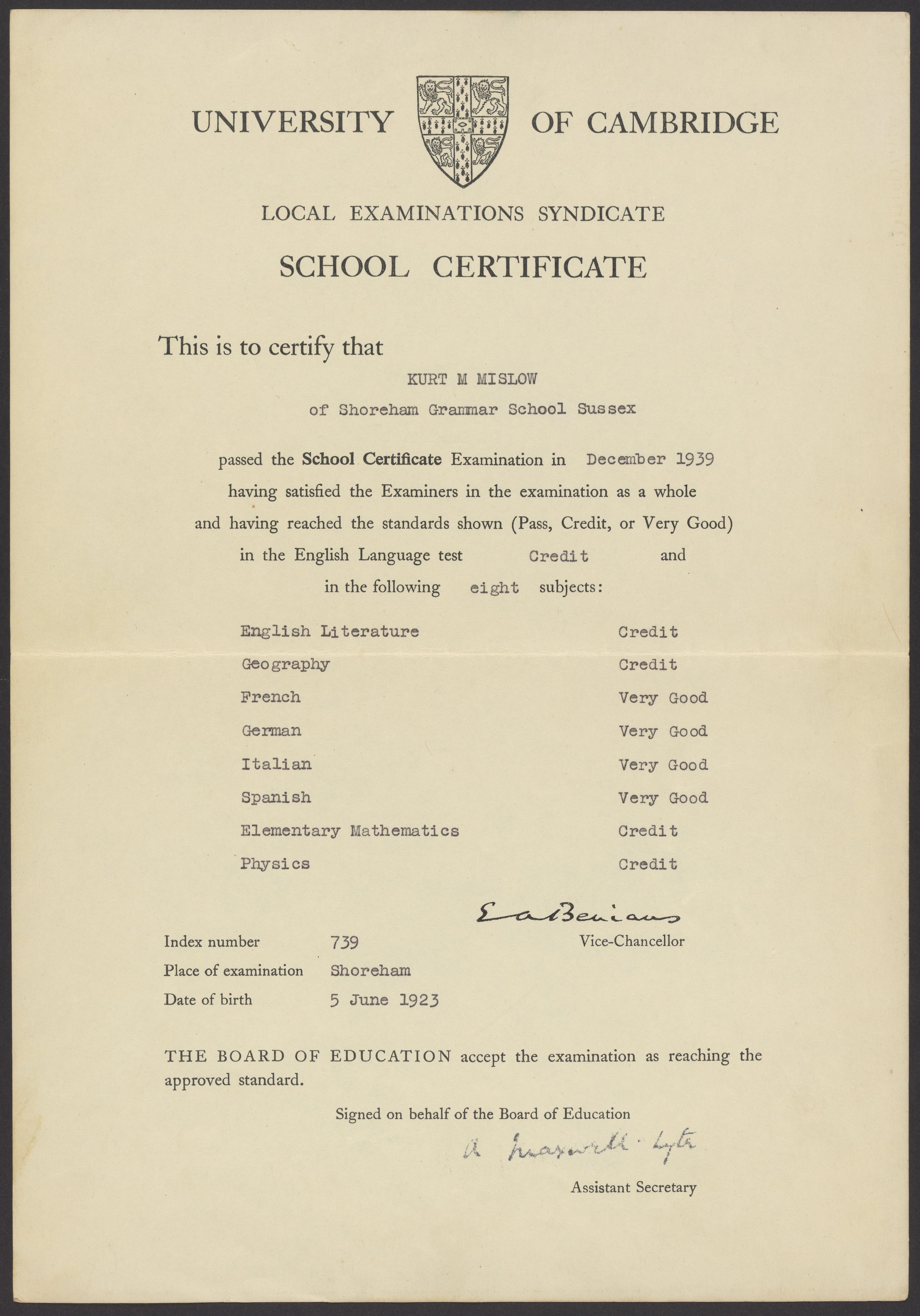 University of Cambridge. “Kurt M. Mislow's School Certificate, 1939,” December 1939. Kurt M. Mislow Papers, Box 21, Folder 32. Science History Institute. Philadelphia. https://digital.sciencehistory.org/works/mddc5uk.