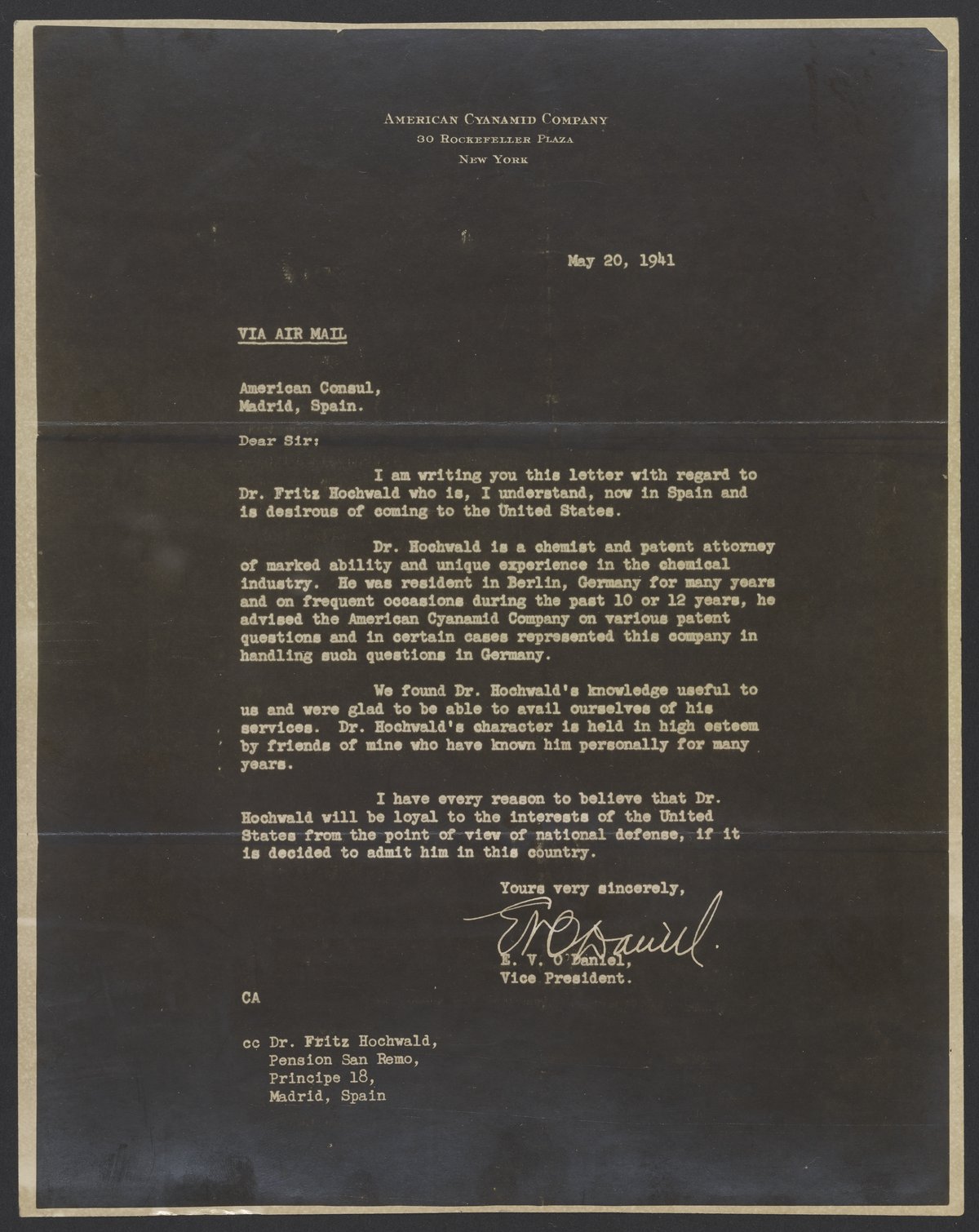E.V. O'Daniel, Vice President of the American Cyanamid Company, writes to the American Consul about Fritz Hochwald (1897-1968). O'Daniel praises Hochwald's character and his relationship with the American Cyanamid Company.