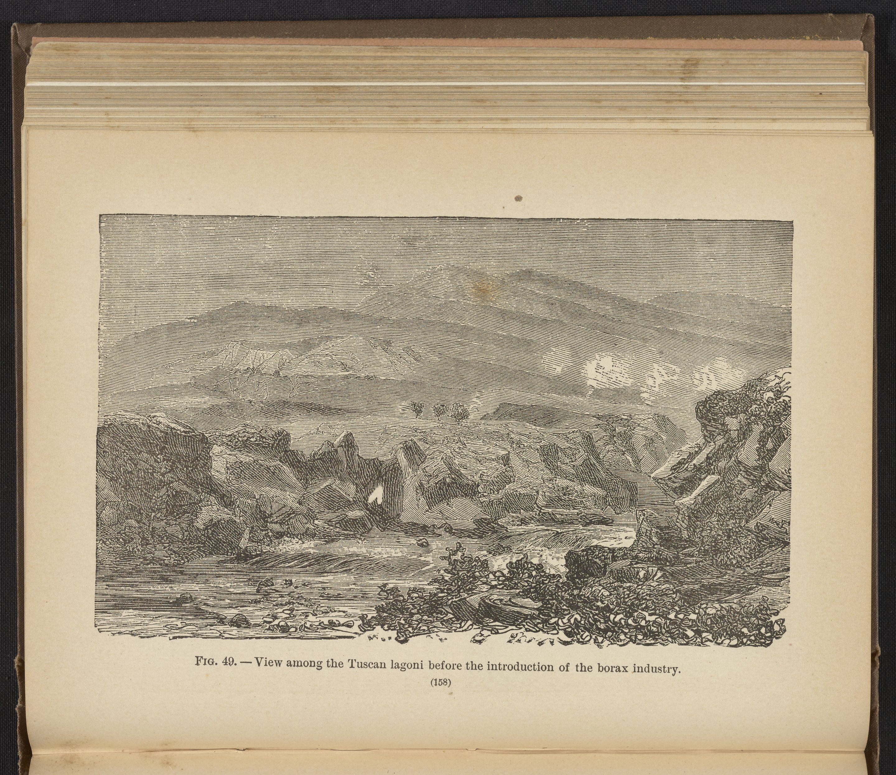 Plate illustrates the Tuscan landscape before the introduction of the borax industry. The foreground depicts Tuscan lagoons, where borax was found circa 1776. Steam charged with boron compounds escapes volcanic crevices called suffioni. Boric acid is formed when this steam hits water.