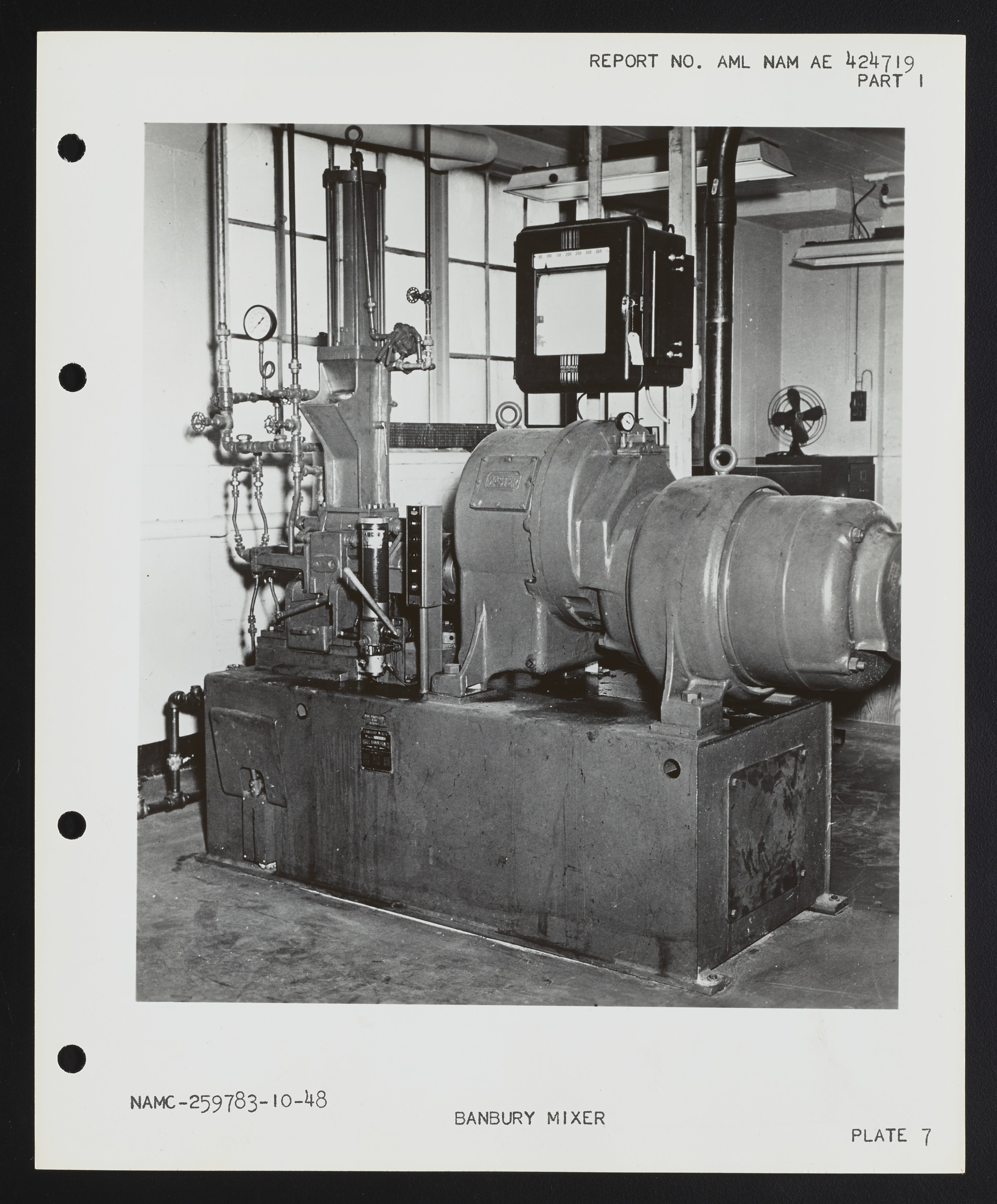 View of the Banbury Mixer used in the Rubber Compounding and Processing Laboratory at the Naval Air Experimental Station. The mixer is a Farrel-Birmingham Co. size B Banbury Mixer with a 25 H.P. motor and four-speed control switches. At the laboratory, the mixer was used to break down and mix rubber stocks that proved difficult to process on a conventional mixing mill and was particularly suited for rapid mixing and master-batching. This photograph was included in a 1949 Naval Air Experimental Station report on compounding rubber.