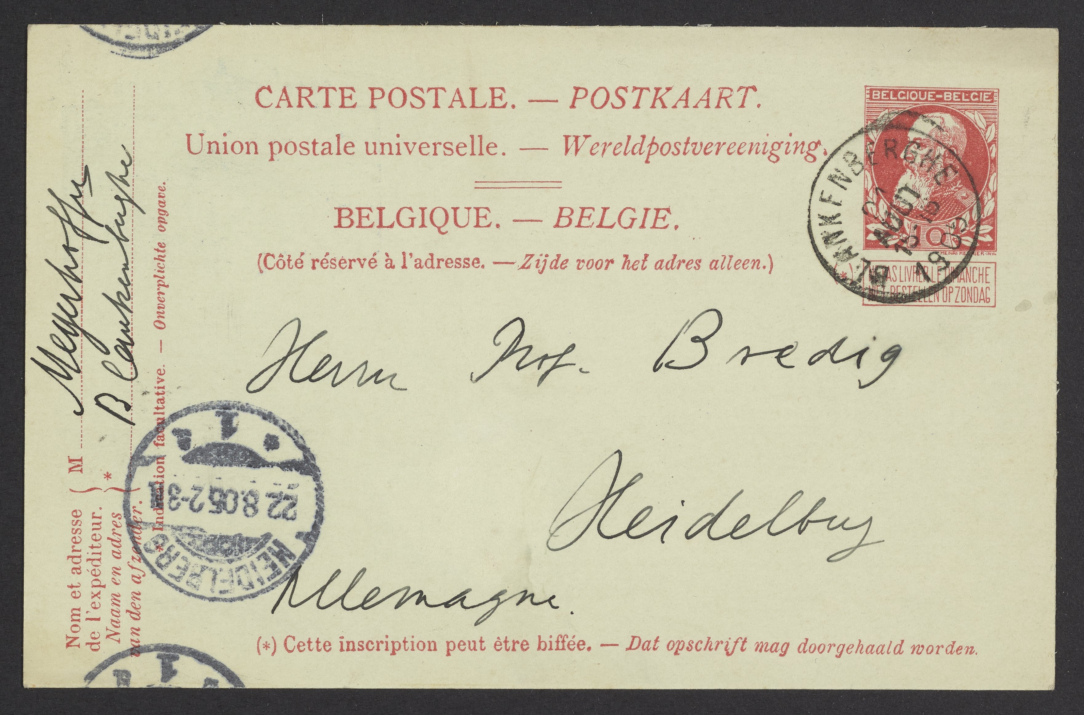 Meyerhoffer, Wihelm. “Postcard from Wilhelm Meyerhoffer to Georg Bredig, August 1905,” August 22, 1905. Papers of Georg and Max Bredig, Box 2, Folder 28. Science History Institute. Philadelphia. https://digital.sciencehistory.org/works/mh3kq7h.
