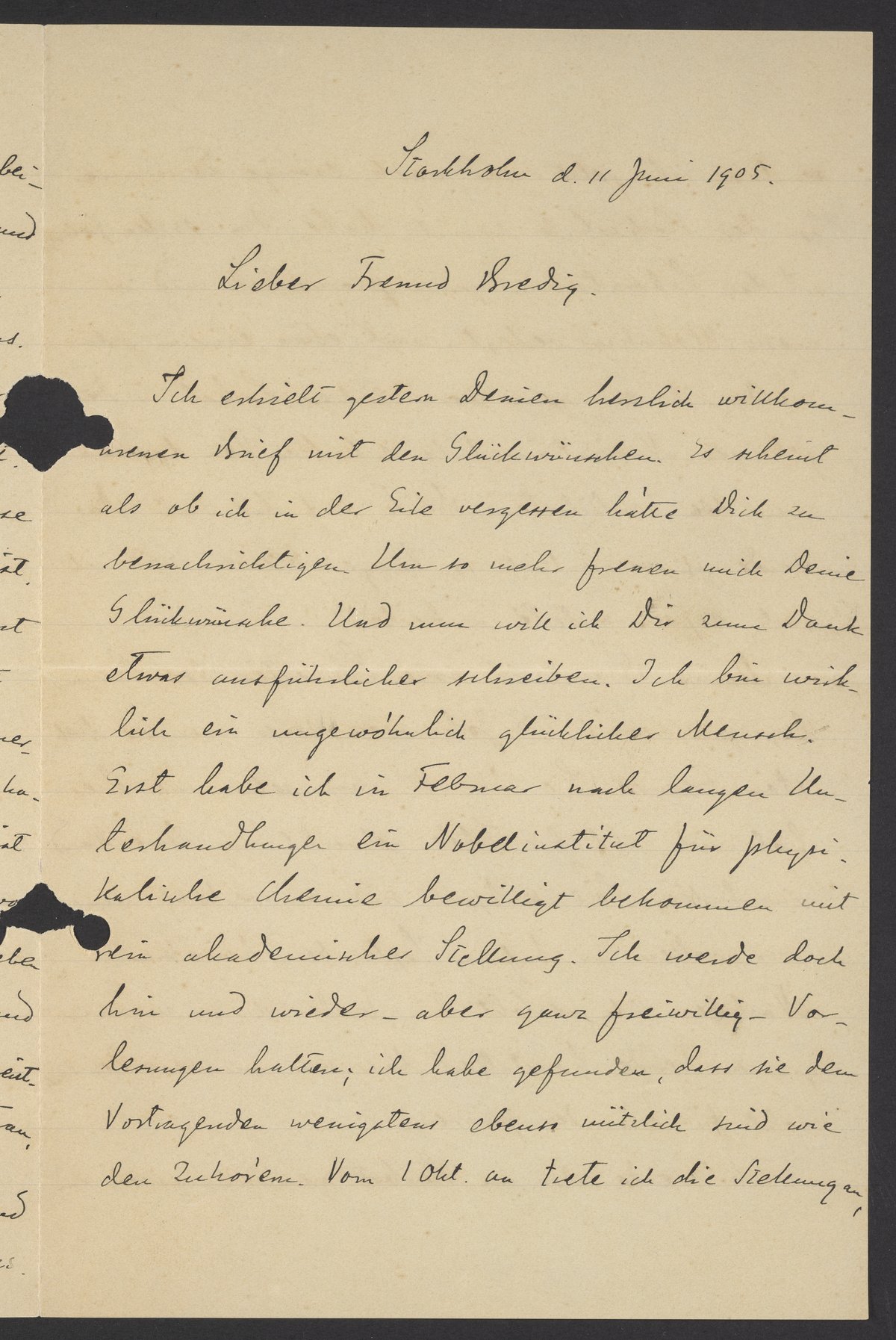 Letter from Svante Arrhenius to Georg Bredig, June 11, 1905