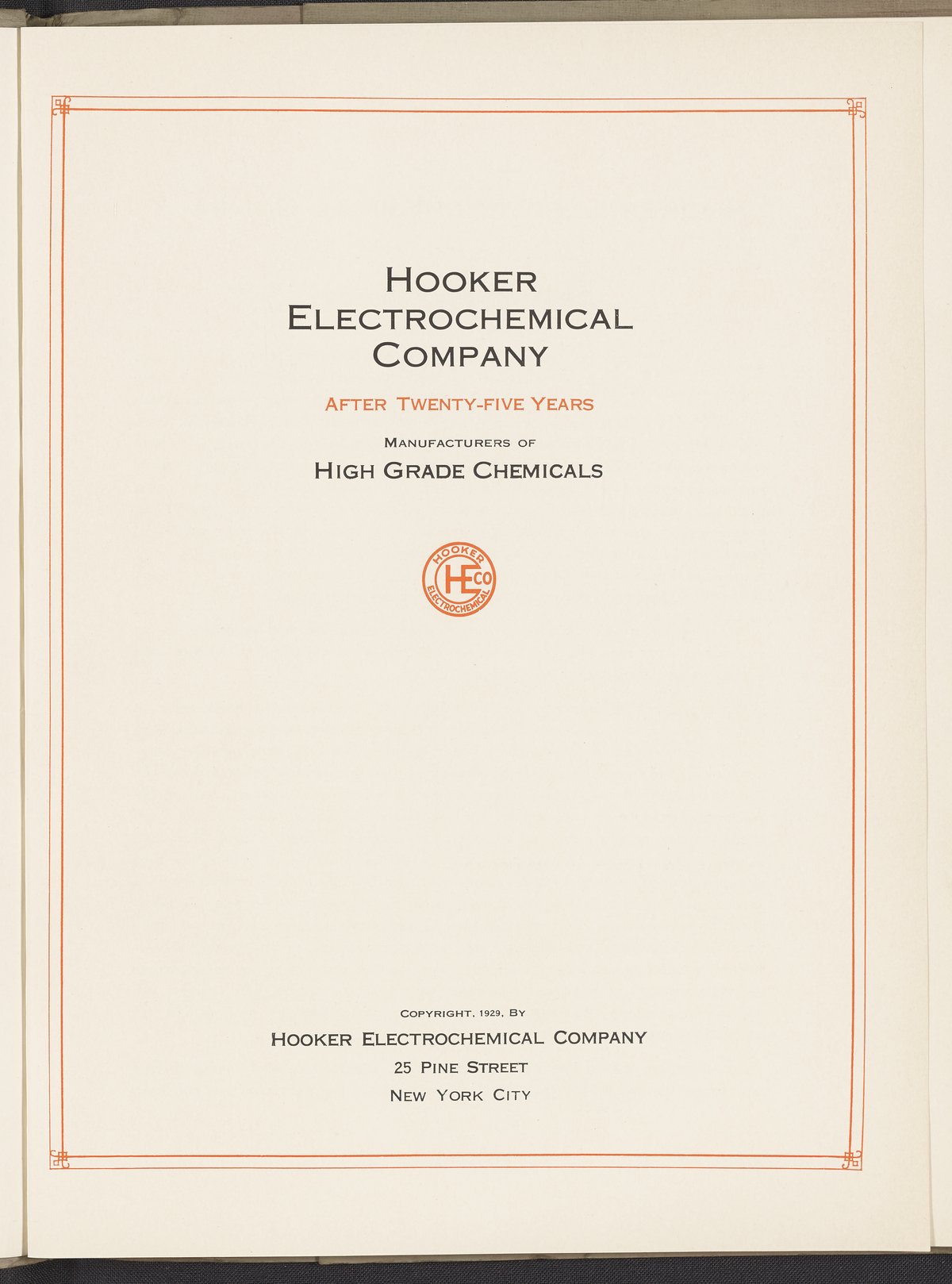 Hooker Chemical Corporation. “Hooker Electrochemical Company after Twenty-Five Years, Manufacturers of High Grade Chemicals.” New York, New York: Hooker Chemical Corporation, 1929. HD9651.9.H66 T66 1929. Science History Institute. Philadelphia. https://digital.sciencehistory.org/works/micidxn.
