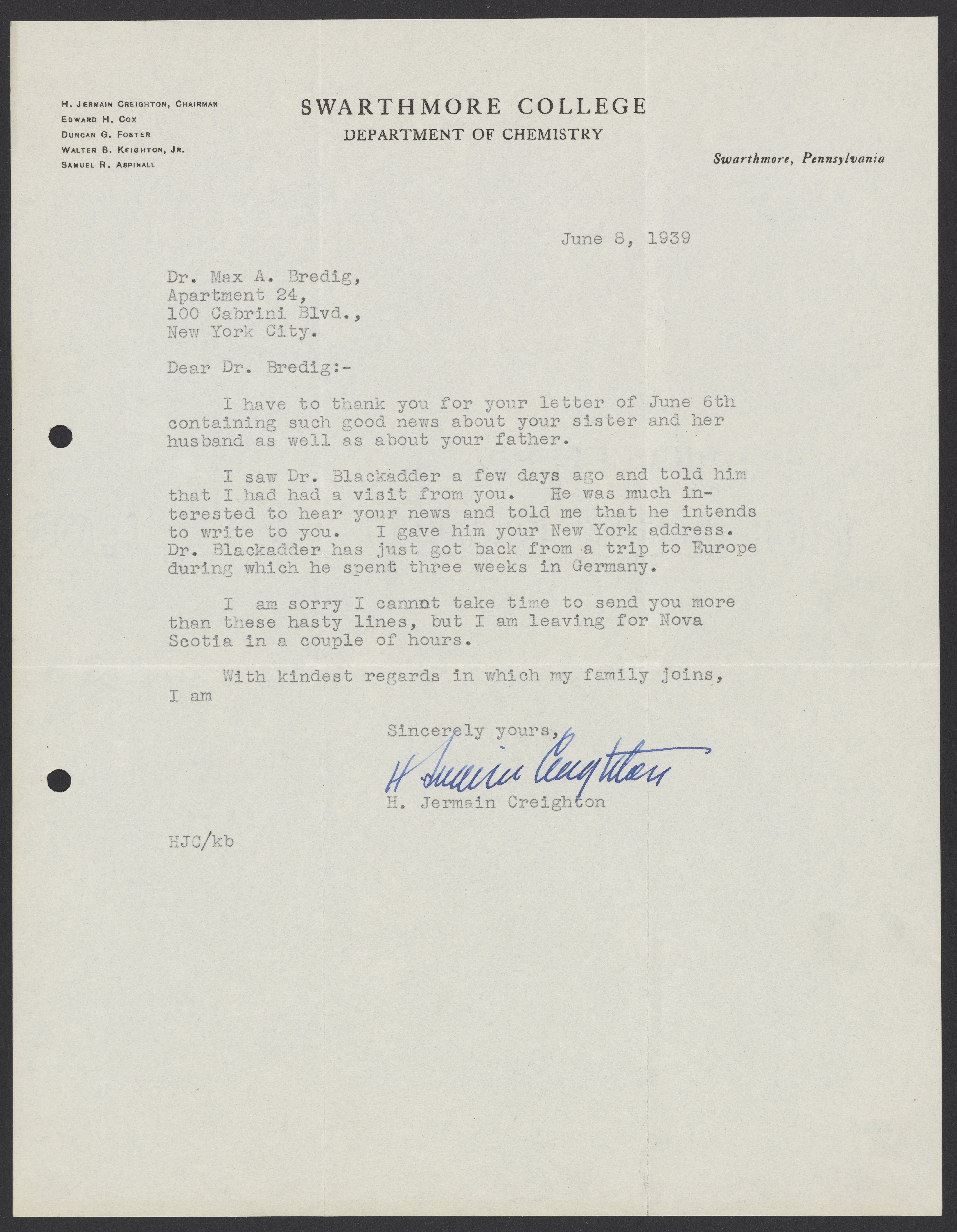 Letter from H. Jermain Creighton to Max Bredig, June 8, 1939