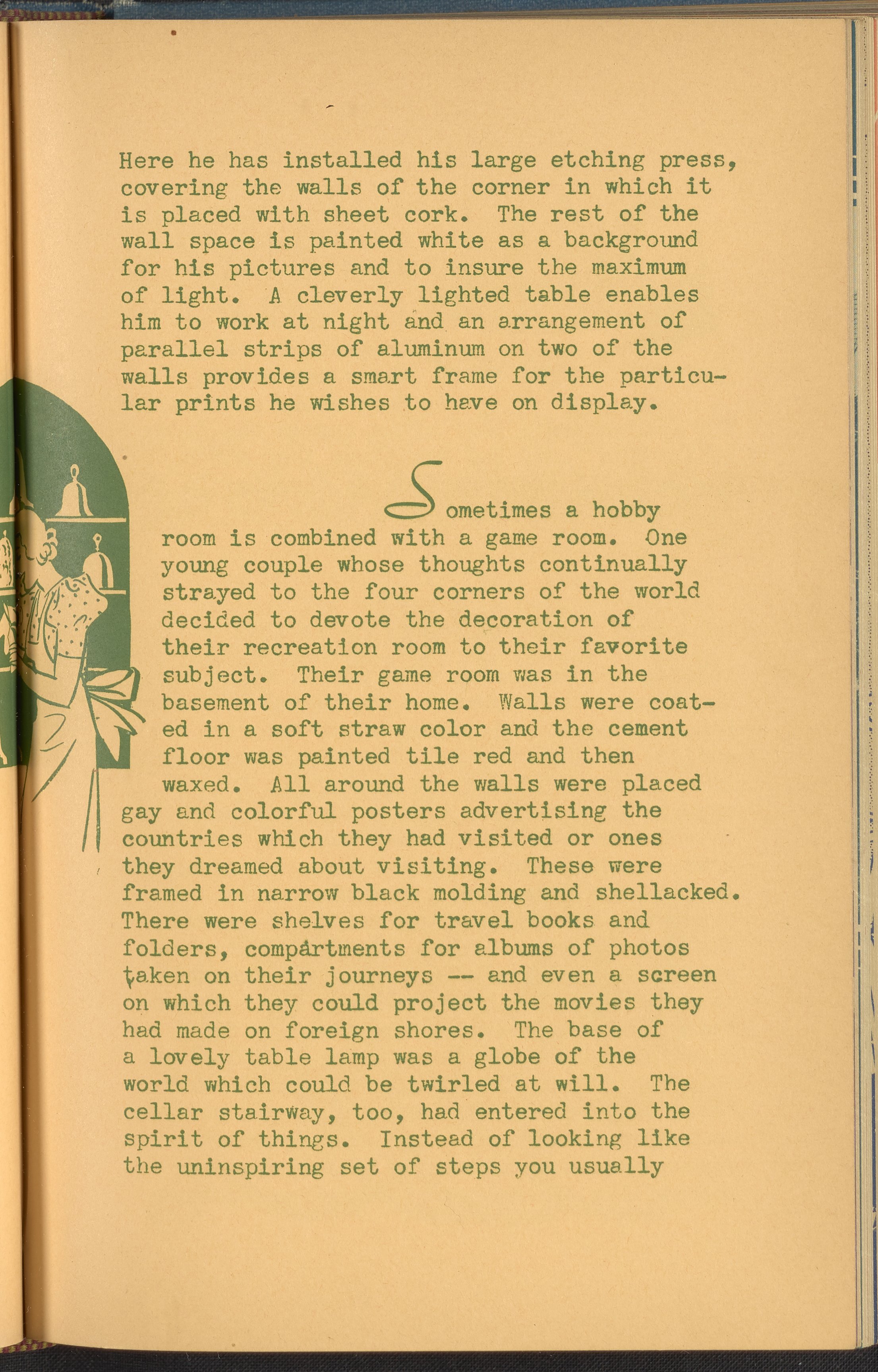 Booklet corresponding to a radio broadcast program created by the National Paint, Varnish, and Lacquer Association. The booklet describes how to decorate a hobby room, emphasizing the use of paint and color. Explains the decorative aspects of rooms suited to hobbies such as stamp collecting, model ship making, etching, or dog care. Also discusses how to decorate a hobby room combined with a game room. Includes small stylized illustrations throughout and decorated covers.