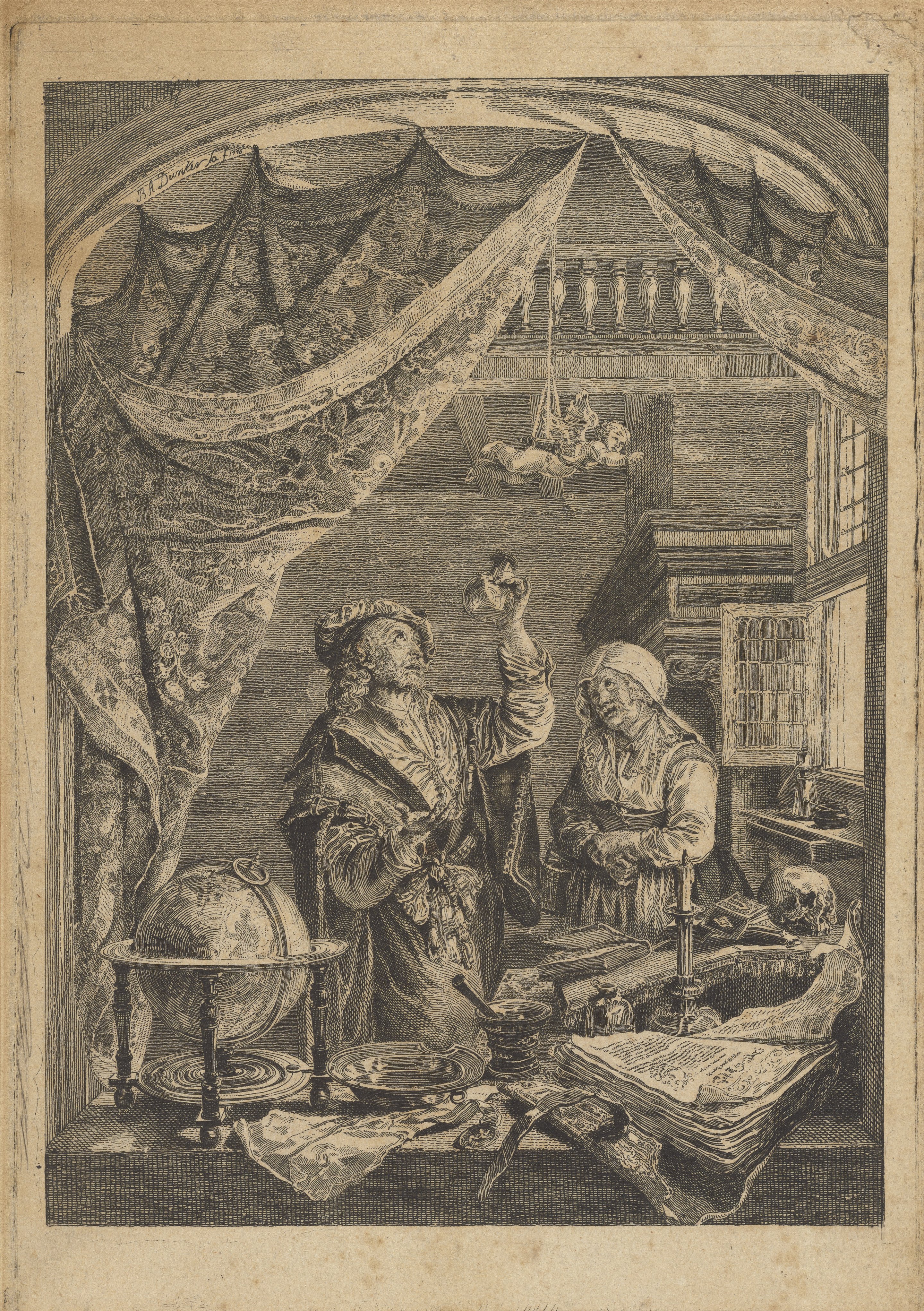 This etching reproduces in reverse a painting in the Hermitage Museum which has been attributed to Gerrit Dou. Through an illusionistic stone archway draped with an embroidered curtain, we see a finely-dressed physician examining a flask of urine in the light of an open window. Wearing a velvet beret and a robe tied with a tasselled cord, the physician gestures dramatically as he performs his examination. Beside him, an older woman stands patiently with her basket, hands clasped. The doctor's paraphernalia surrounds them: a globe, books, flasks, and a human skull arranged on the tabletop speak both to professional habits and symbolic reminders of morality and mortality. Above the central pair, a plaster cupid hangs suspended from the ceiling—likely an indication that the physician's diagnosis will be "lovesickness," a condition once believed to affect women both emotionally and physiologically.