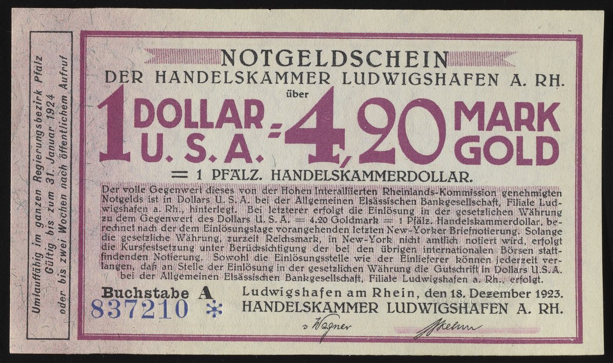 • Ludwigshafen Chamber of Commerce 1 Dollar = 4.20 Goldmark emergency money bill