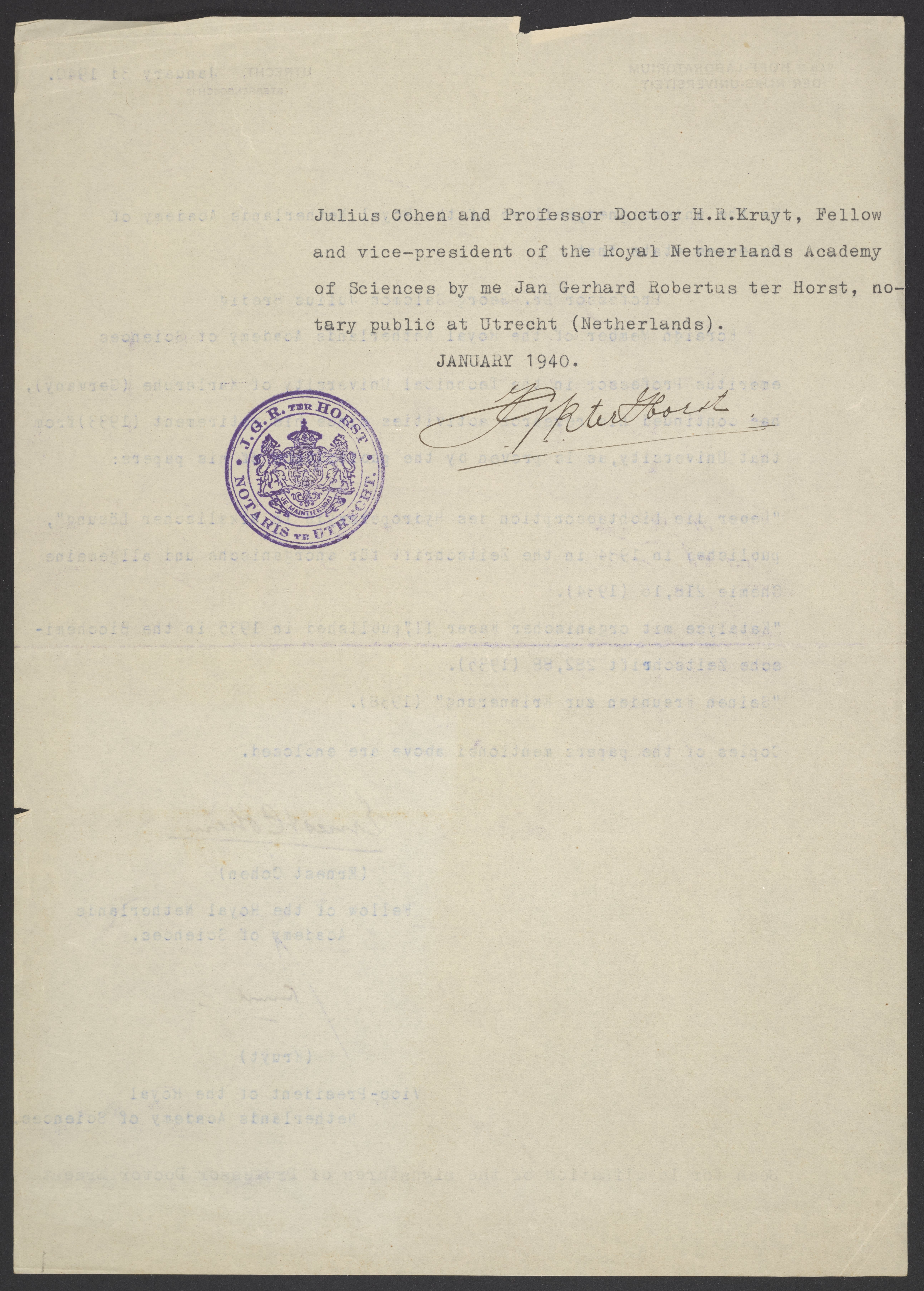 Statement from the Fellows of the Royal Netherlands Academy of Sciences regarding Georg Bredig's research activities from 1933-1940