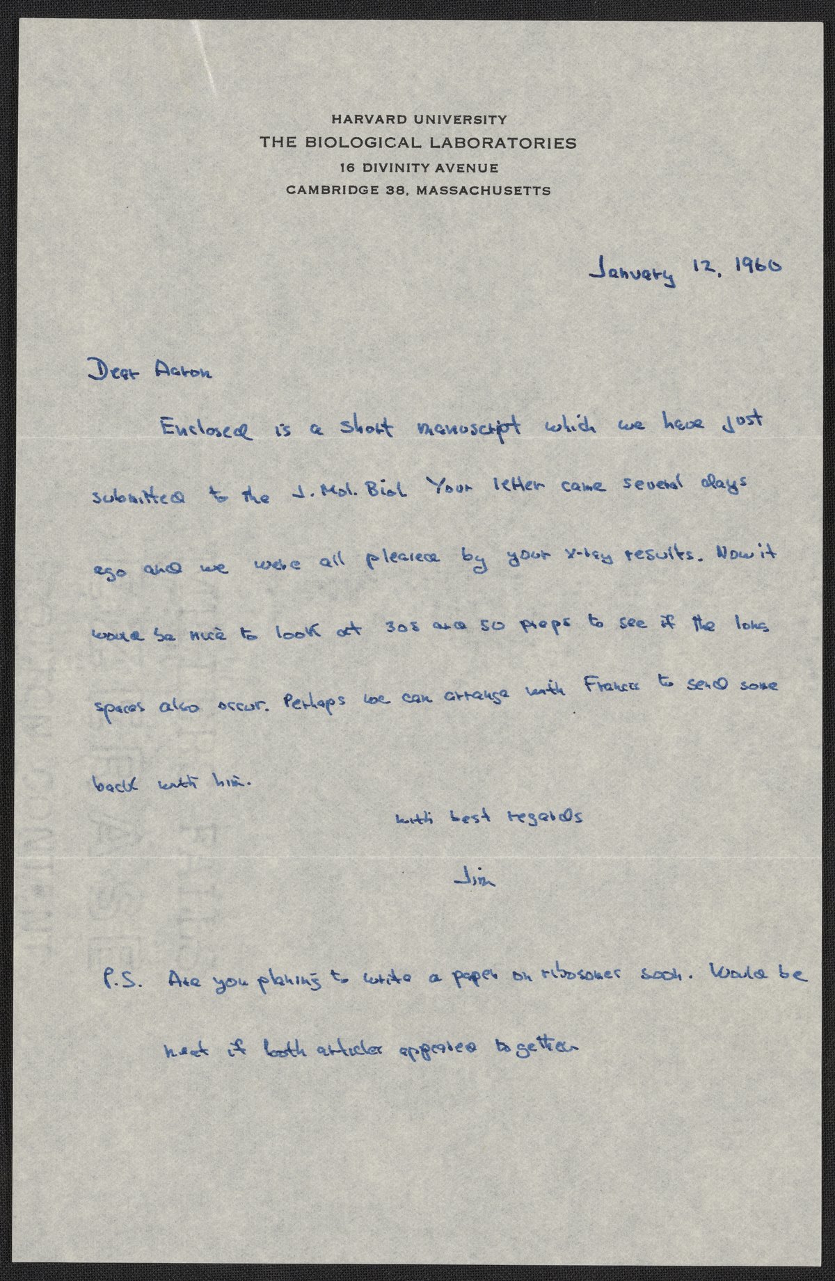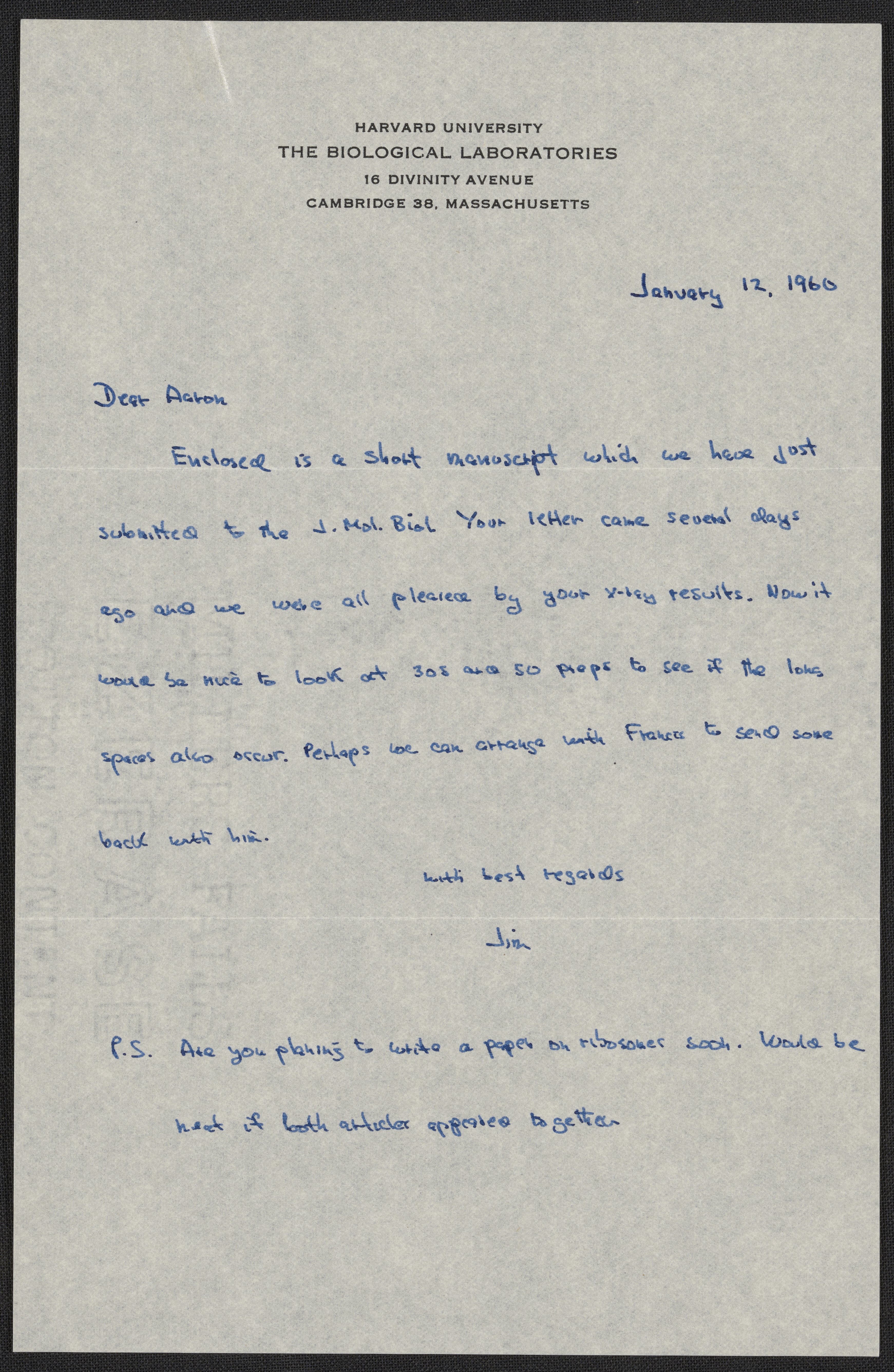 Letter from James Watson to Aaron Klug, January 12, 1960