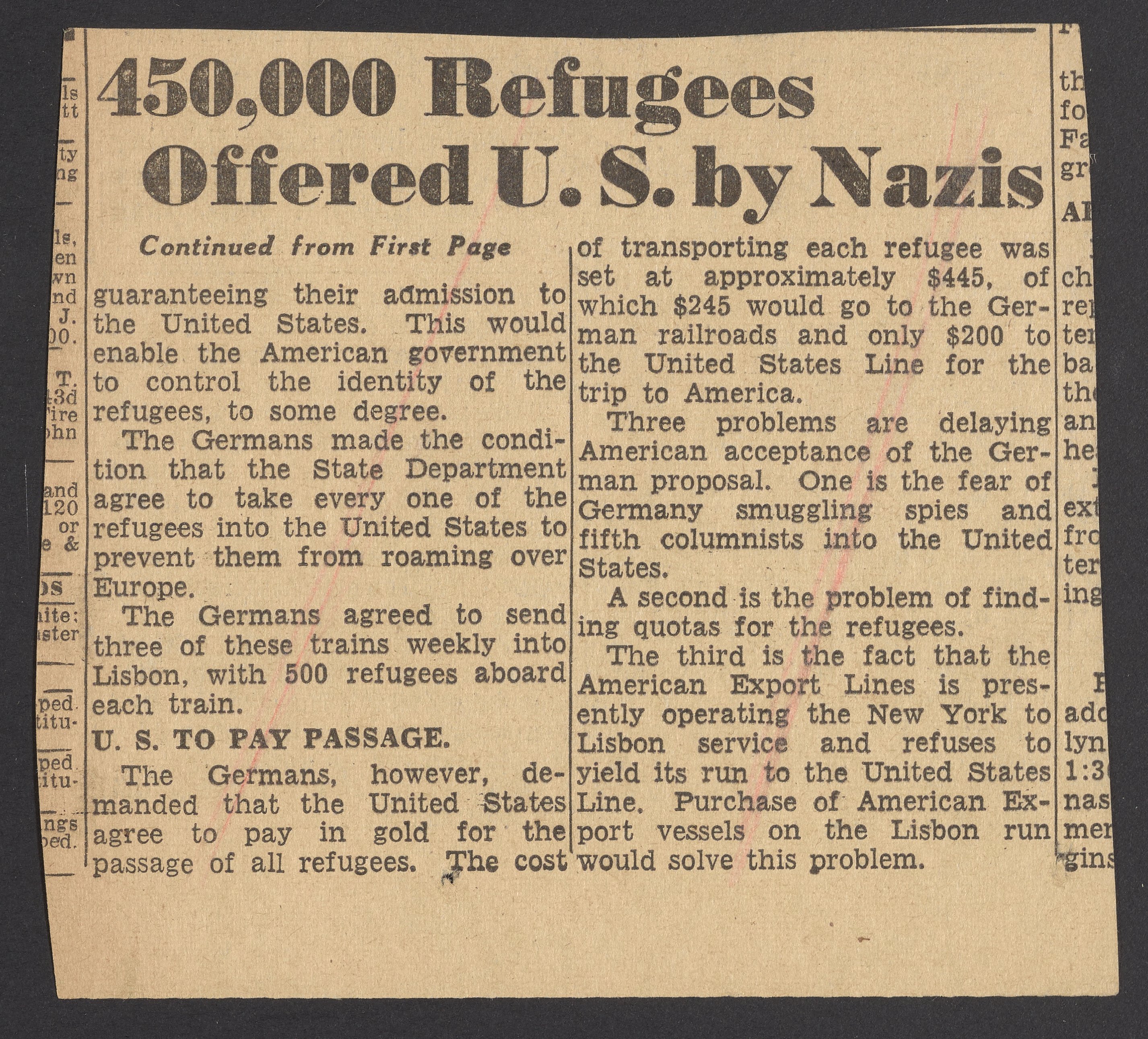 “450,000 Refugees Offered U.S. by Nazis.” United States, circa 1941. Papers of Georg and Max Bredig, Box 10, Folder 24. Science History Institute. Philadelphia. https://digital.sciencehistory.org/works/mmax8yh.