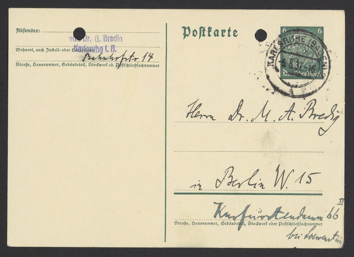 Postcard from Georg Bredig to Max Bredig, June 6, 1937