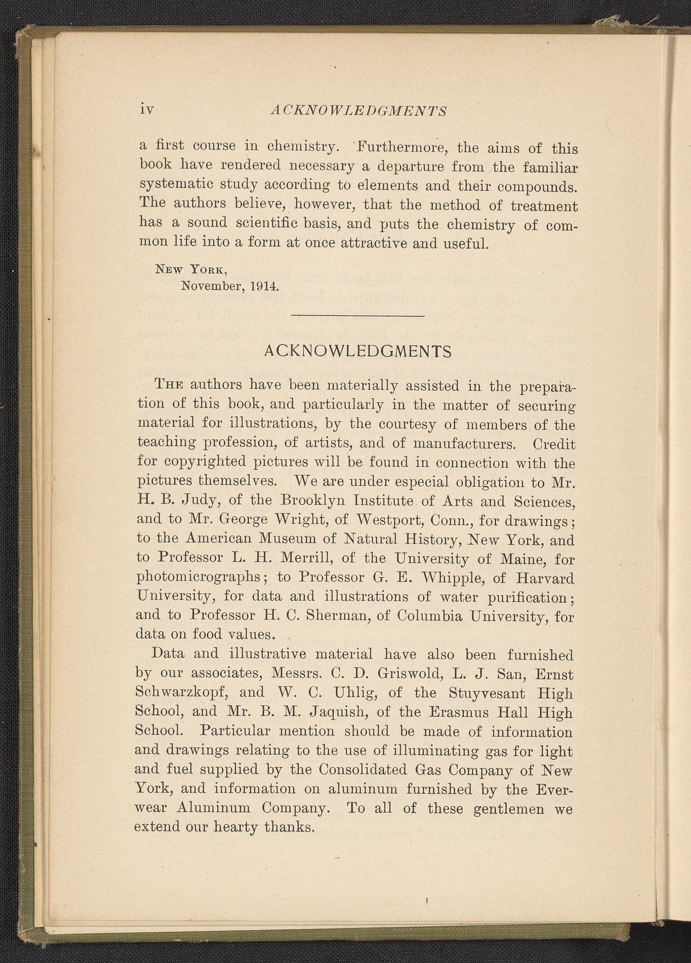 Small JPG1200 x 1625px — 467 KBFull-sized JPG2396 x 3244px — 1.6 MBOriginal fileTIFF — 2396 x 3244px — 22.3 MBA chemistry textbook intended for secondary students who are limited to a single course in chemistry; the work introduces the practical application of chemistry principles for use in daily life. The text covers a wide range of topics so teachers may curate a curriculum best suited for their student's needs, with topics including industrial, technical, agricultural, and domestic science applications of chemistry. The work includes two parts. The first reviews fundamental ideas and principles of chemistry, and the second contains additional material for specialized topics. The work is fully illustrated with black and white prints.