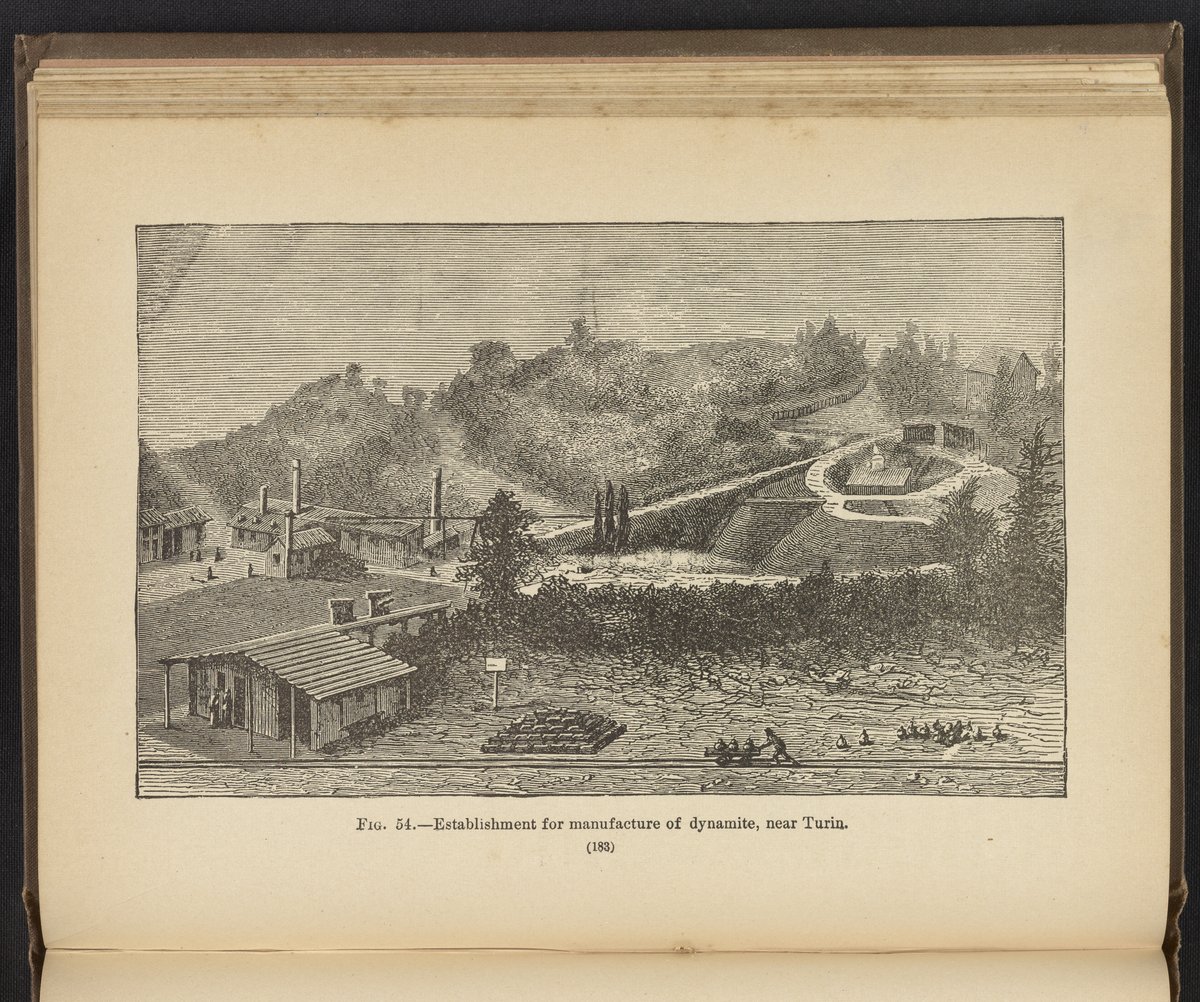 Appleton, John Howard. “Figure 54: Dynamite Manufacturing Establishment near Turin, Italy.” Chemistry, Developed by Facts and Principles Drawn Chiefly from the Non-Metals. Providence, Rhode Island: Providence Lithograph Company, 1884. https://digital.sciencehistory.org/works/mn4cj85.