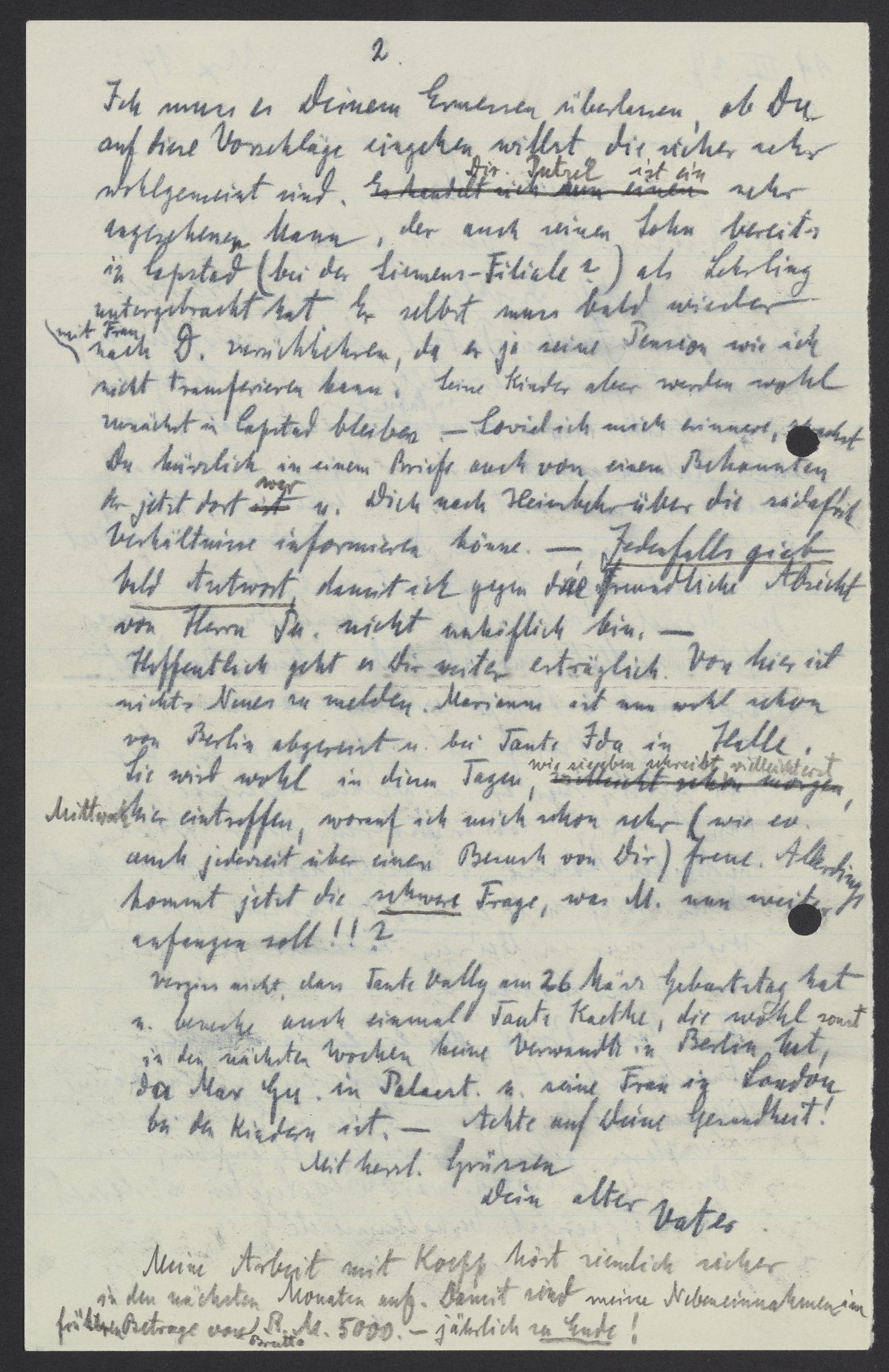 Vergiss nicht, dass Tante Vally am 26 März Geburtstag hat u. besuche auch einmal Tante Kaethe, die wohl sonst in den nächsten Wochen keine Verwandte in Berlin hat, da Max Gu. in Palaest. u. seine Frau in London bei den Kindern ist. – Achte auf Deine Gesundheit!